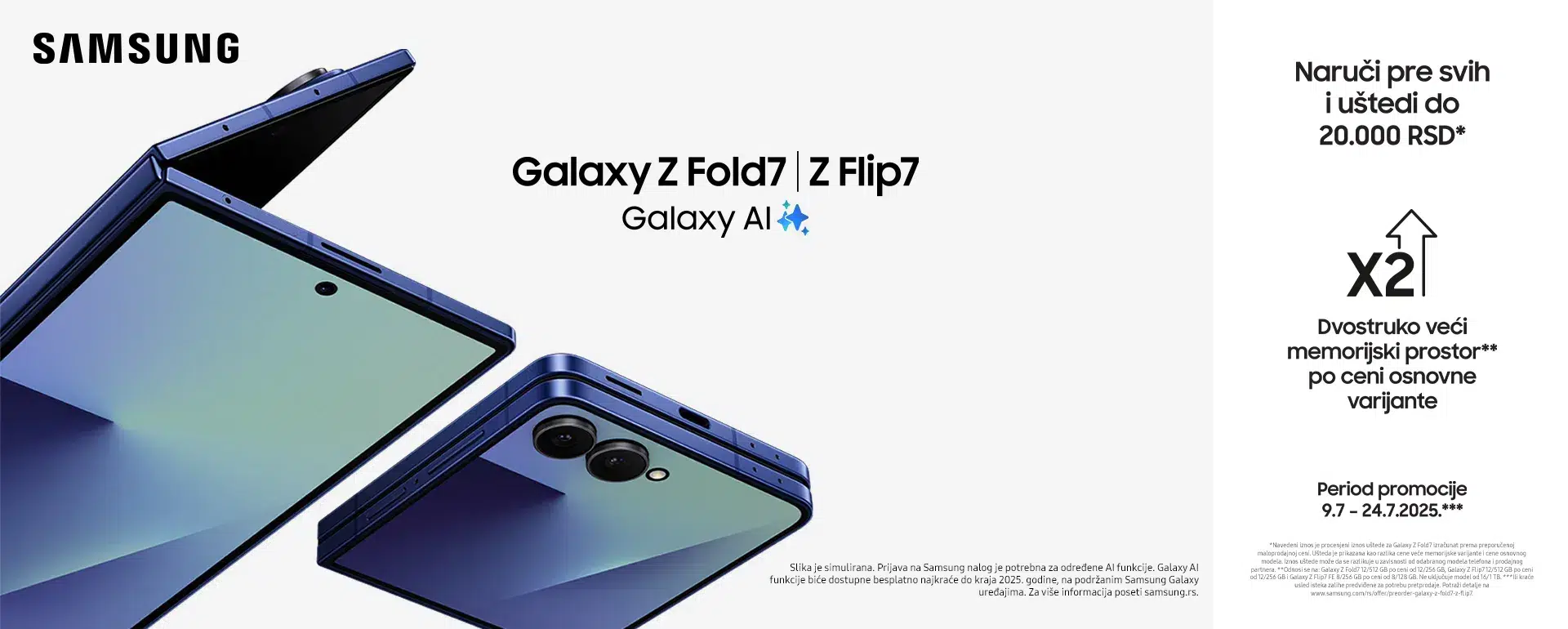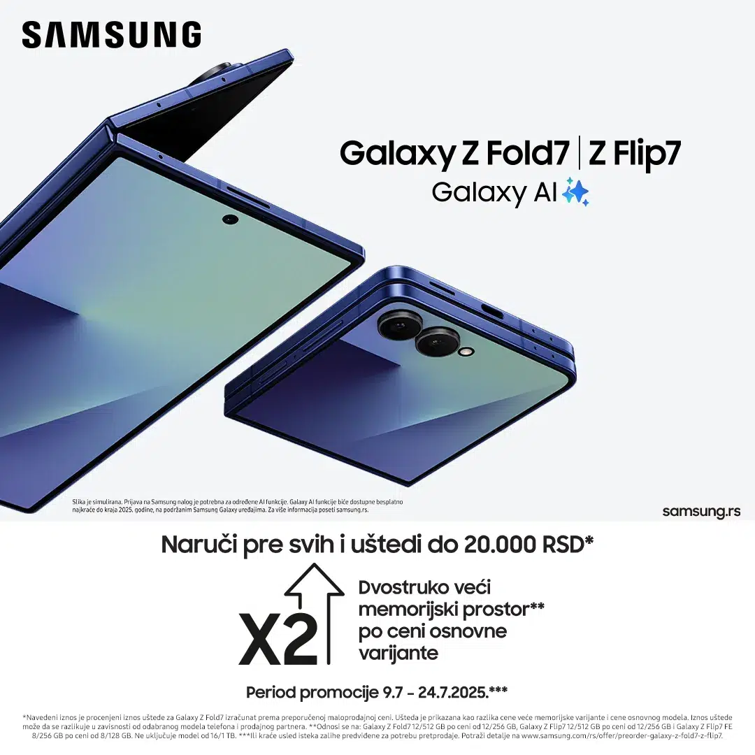 Iskoristite posebnu ponudu tokom pretprodajnog perioda – od 9. do 24. jula 2025. godine – i obezbedite svoj Galaxy Z Fold7 (12/512 GB), Galaxy Z Flip7 (8/512 GB) ili Galaxy Z Flip7 FE (8/256 GB) po ceni osnovnih verzija sa manjim kapacitetom: Fold7 12/256 GB, Flip7 8/256 GB i Flip7 FE 8/128 GB.