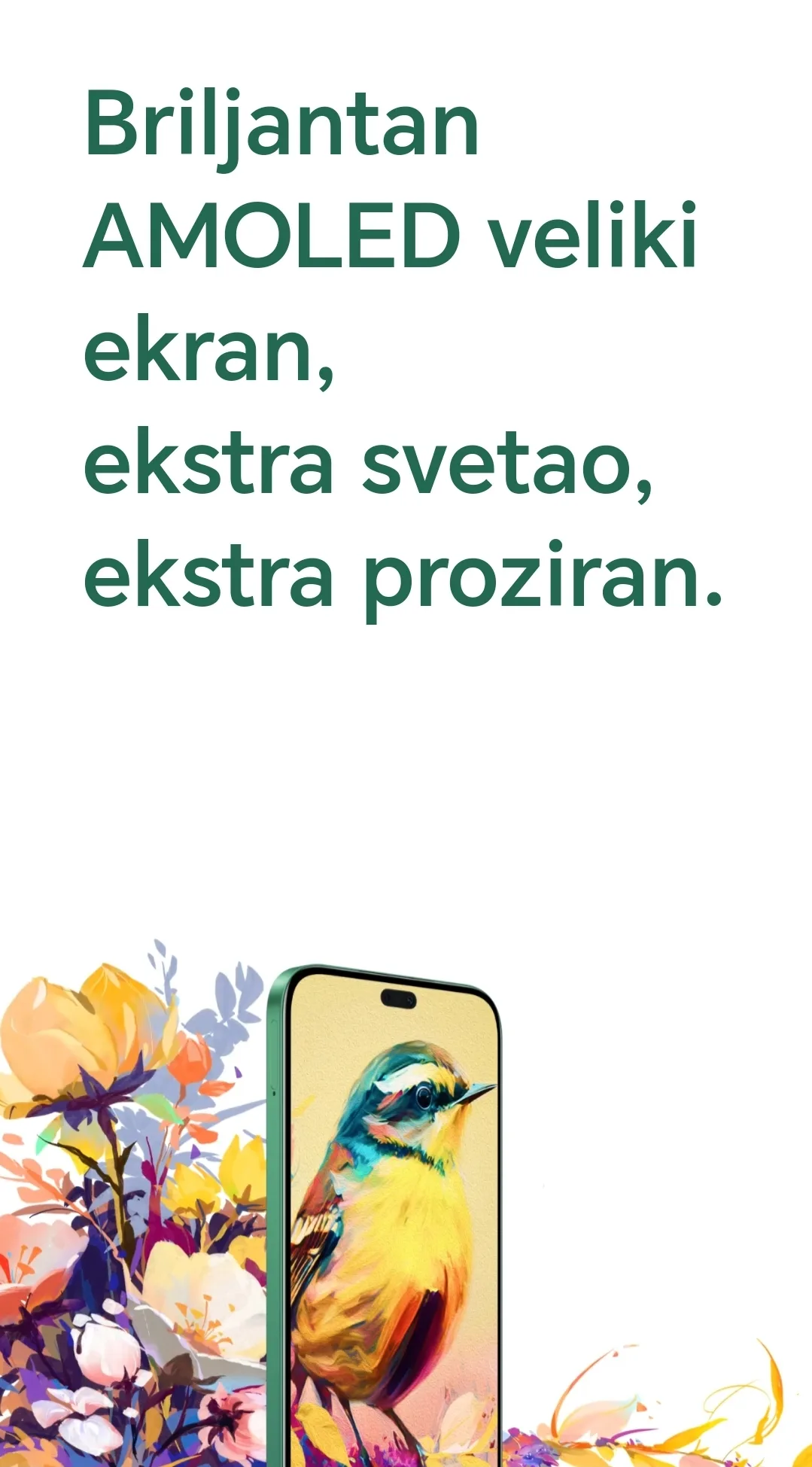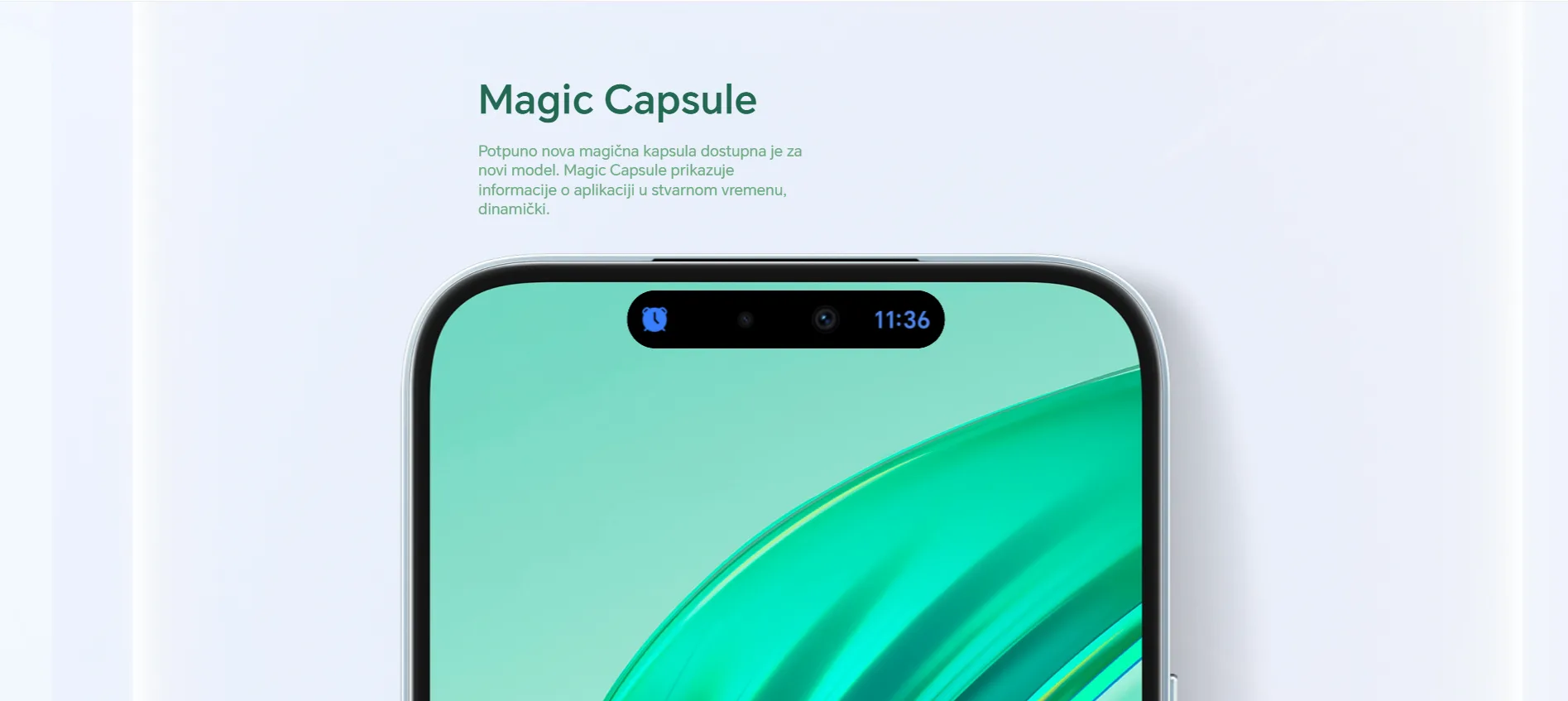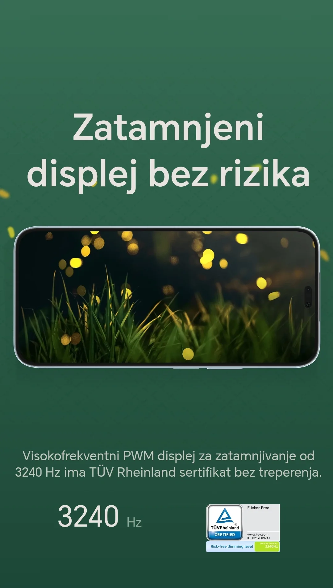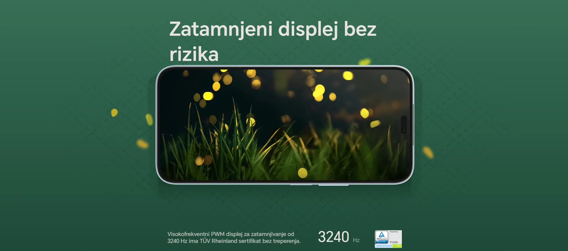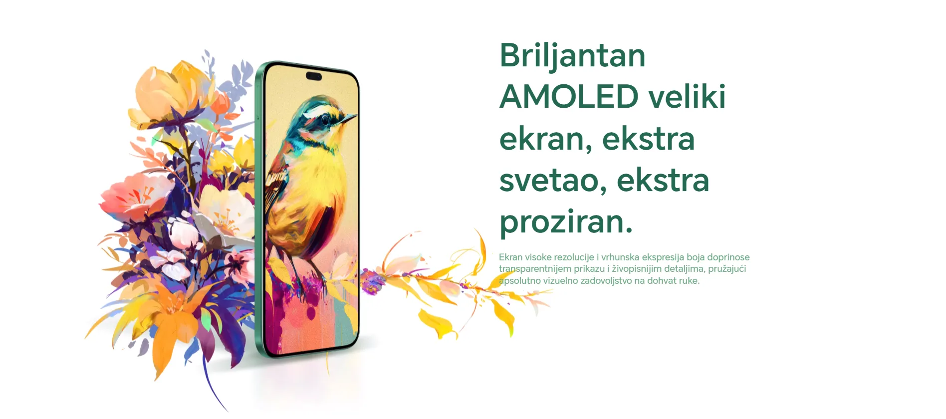 Veliki AMOLED ekran od 6.7 inči, FHD+ rezolucija i impresivna svetlina do 2000 nita za kristalno čiste slike. Sa 93,7% odnosa ekrana i tela, ovaj ekran donosi neuporedivu jasnoću i boje. Oble ivice su nešto što će vam svakako privući pažnju, kao i magična kapsula za obaveštenja. TÜV Rheinland certifikat protiv treperenja i zaštita od plavog svetla osiguravaju udobnost gledanja u svim uslovima. Uživaćete u dinamičkom zatamnjenju ekrana, cirkadijskom noćnom prikazu, i više, za vrhunski vizuelni doživljaj.