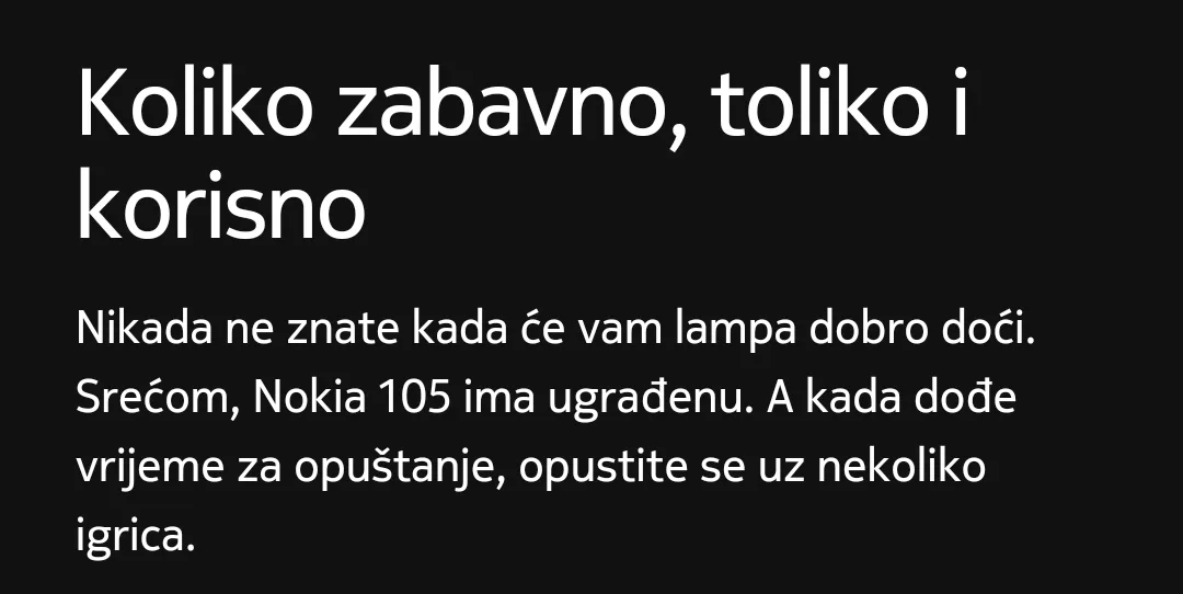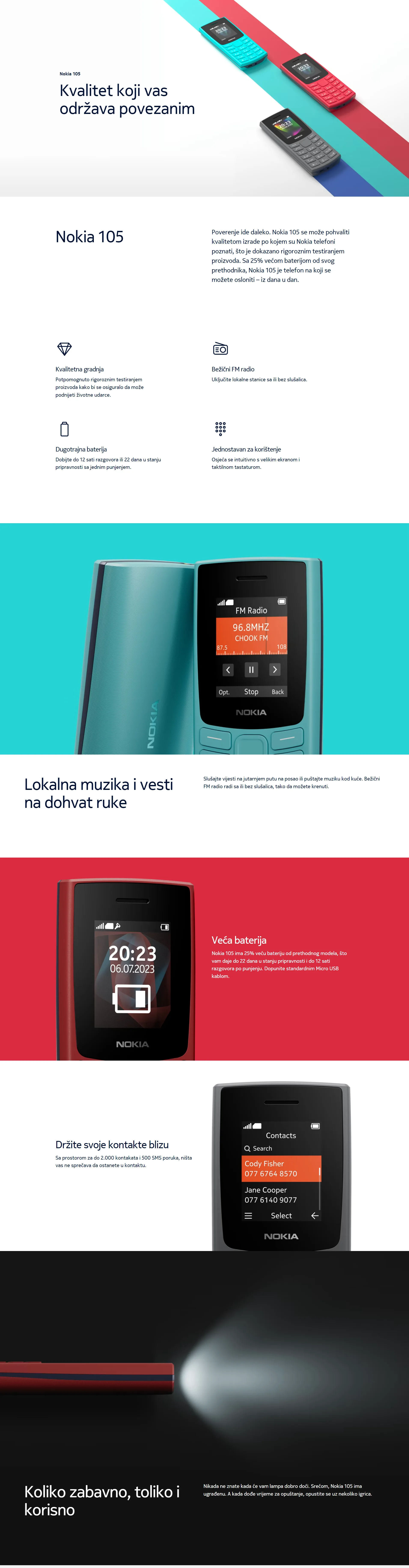 Osim toga, Nokia 105 ima ugrađenu LED svetiljku, koja može biti izuzetno korisna u situacijama kada vam je potrebno osvetljenje u mraku. To je funkcija koja može biti posebno korisna u slučaju nestanka struje ili prilikom kretanja po nepoznatom terenu.
