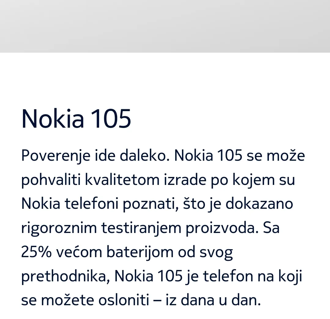 Ukratko, Nokia 105 (2023) je jednostavan, pouzdan i izdržljiv telefon koji nudi osnovne funkcije za svakodnevnu komunikaciju. Bez nepotrebnih komplikacija i sofisticiranih funkcija, ova Nokia klasična serija ima sve što vam je potrebno da ostanete povezani, bilo da ste kod kuće ili u pokretu. Sa povoljnom cenom, i kvalitetom koji krasi brend Nokia, svakako ćete napraviti pravi izbor.