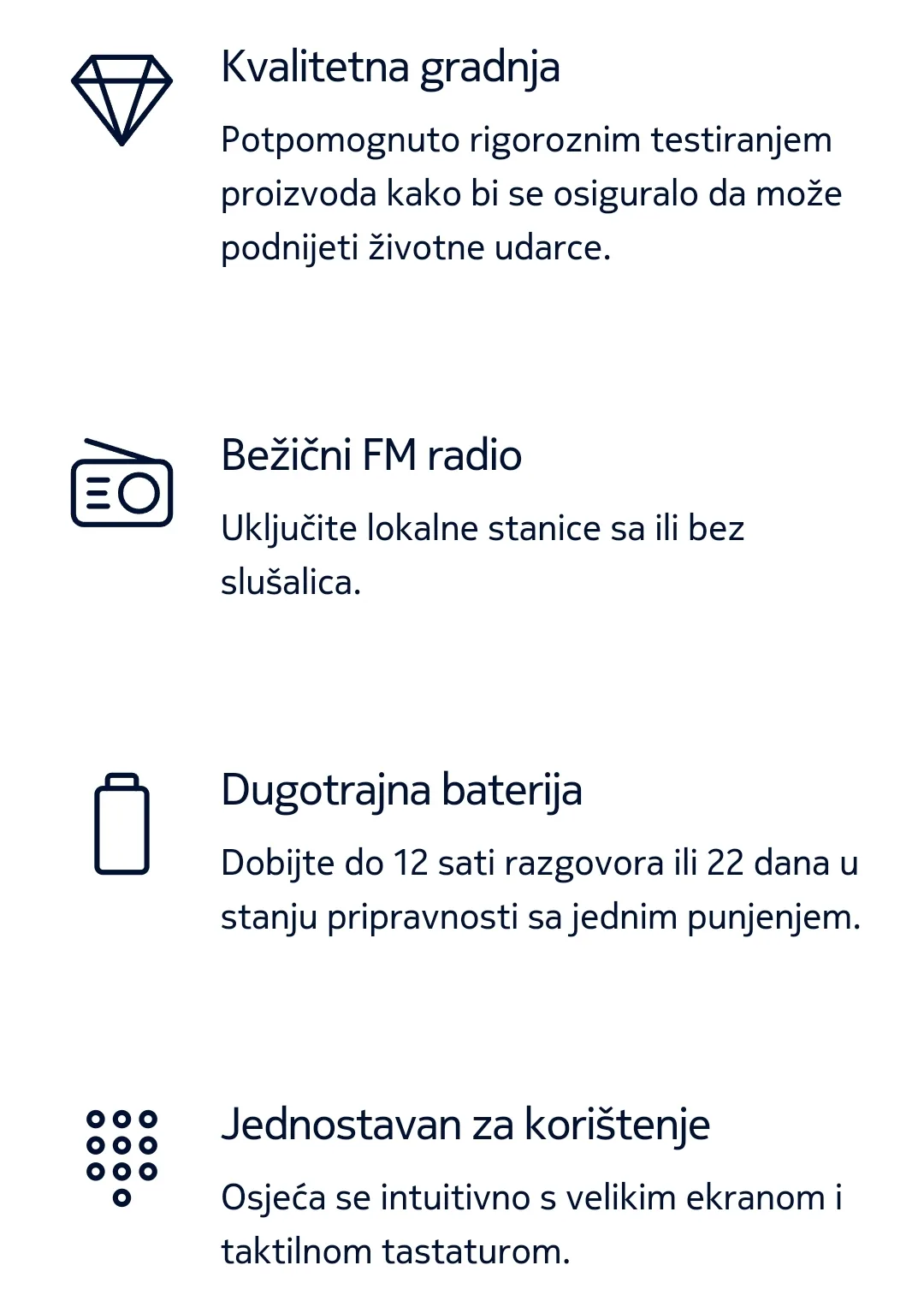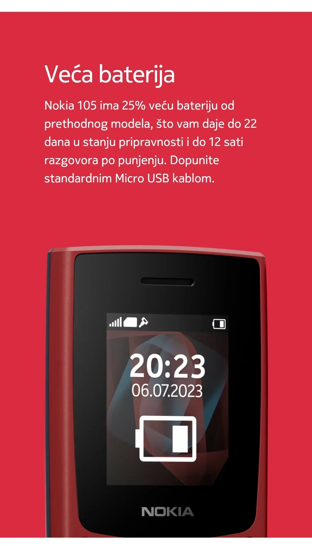 Jedna od ključnih karakteristika Nokia 105 (2023) je njen izdržljivi baterijski život. Sa jednim punjenjem, može izdržati i do nekoliko dana u stanju mirovanja, što je idealno za ljude koji se ne žele brinuti oko čestog punjenja telefona. Takođe, telefon ima jasan i čitljiv ekran, koji omogućava jednostavno čitanje poruka i brojeva čak i na jakom suncu.