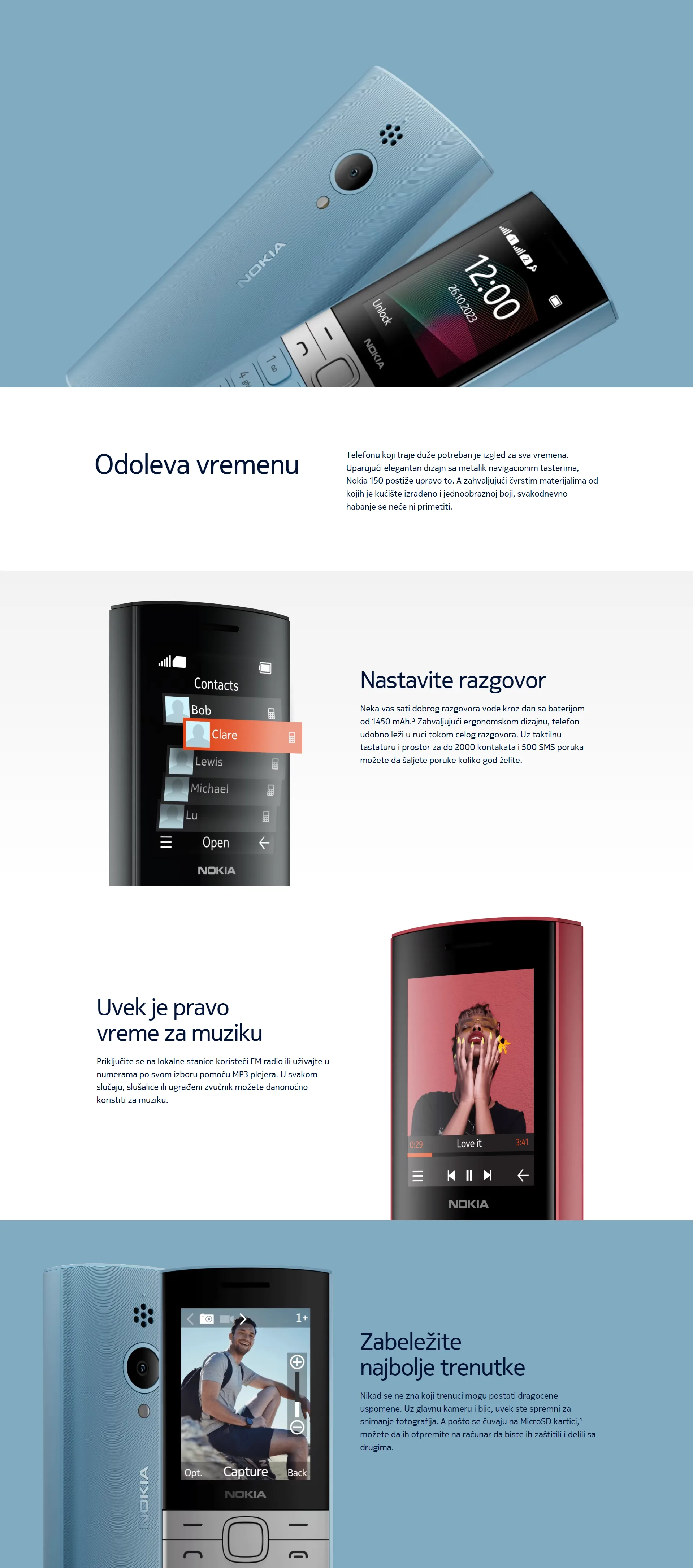 Sa 4MB interne memorije, Nokia 150 može da čuva do 2000 kontakata. Ako vam je potrebno više prostora, možete koristiti microSDHC karticu sa kapacitetom do 32GB.