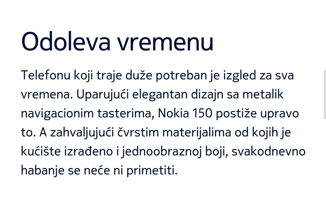 Nokia 150 je odličan telefon za starije osobe, kao i za sve one koji traže jednostavan, pouzdan uređaj. Povoljna cena telefona, je idealno rešenje za sve koji ne žele da daju puno novca.