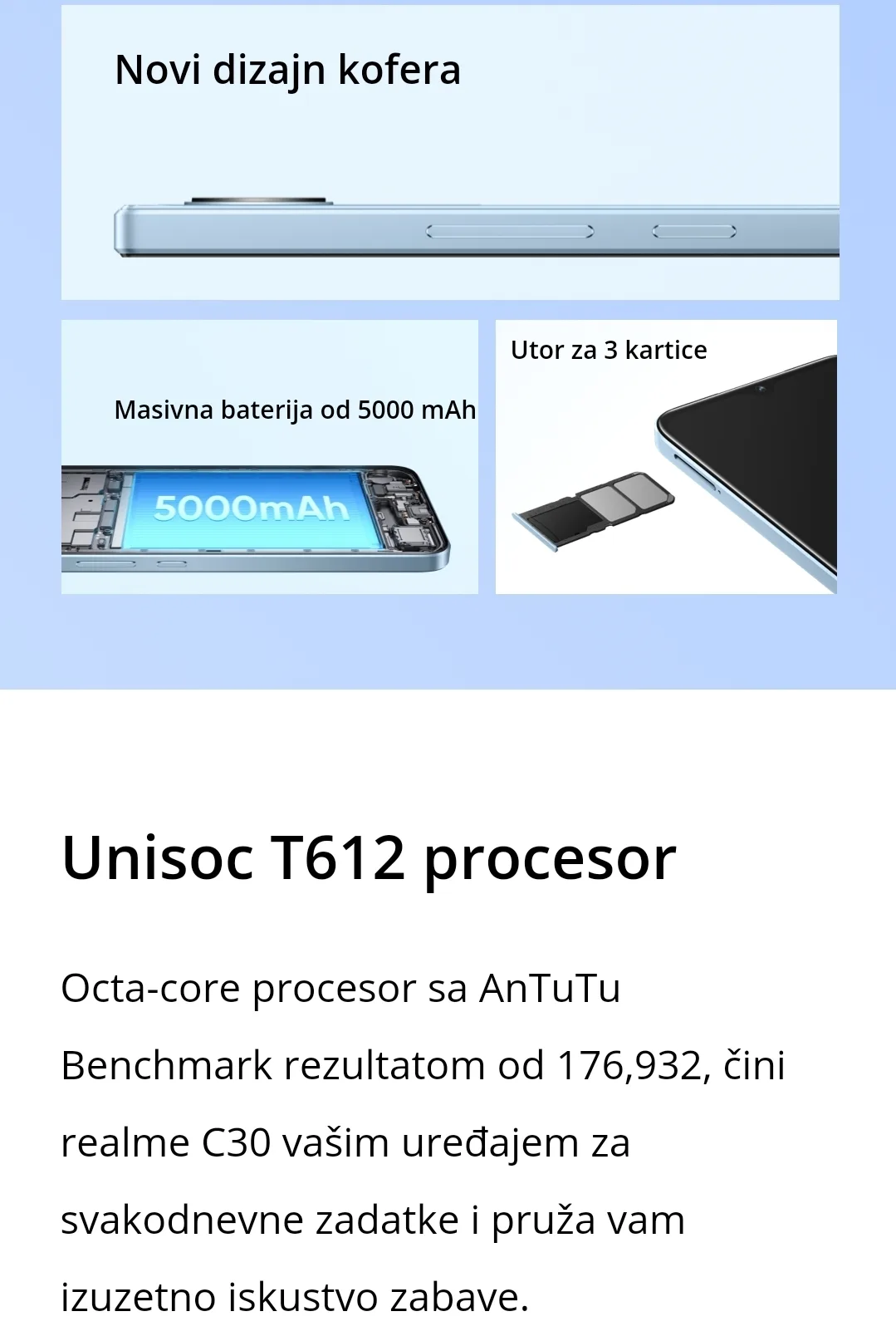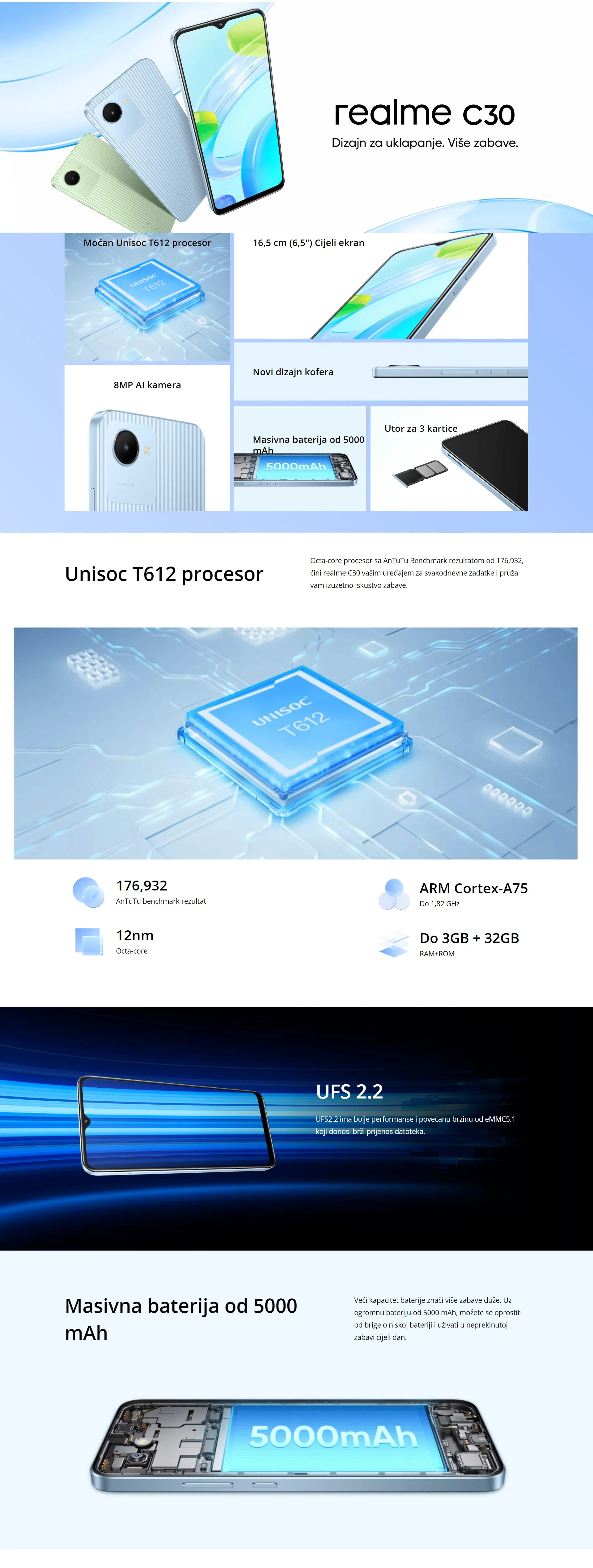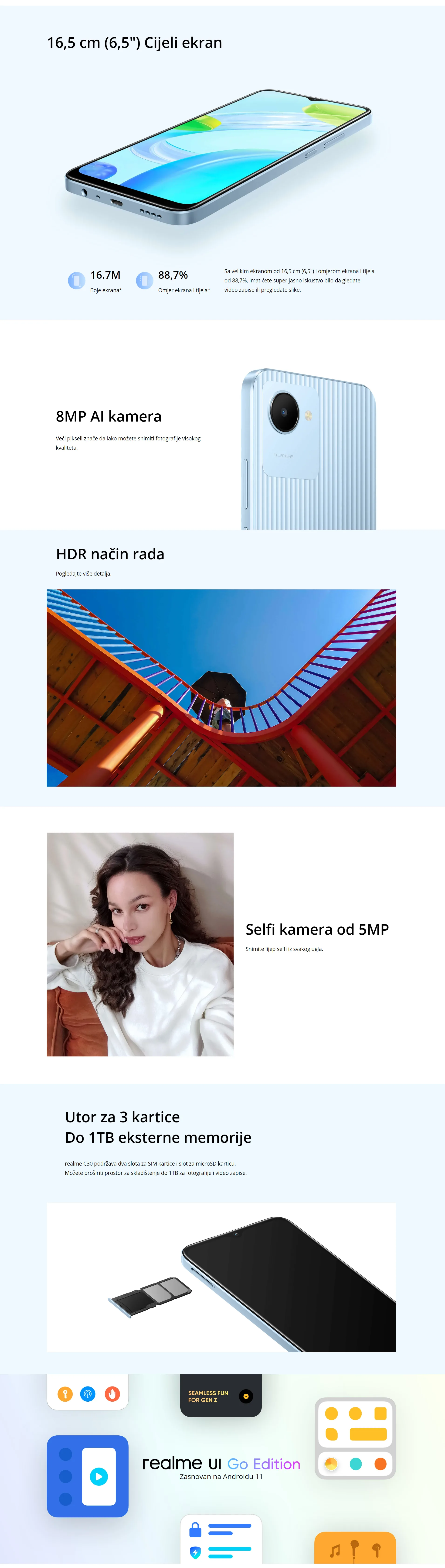 Super-izdržljiva baterija na Realme C30 omogućava vam da se suočite sa životnim izazovima. Zato što ogromna baterija od 5000 mAh lako traje ceo dan, ako ne i duže. Snažna kamera od 8 MP snima detalje briljantnog sveta. Pejzaži, portreti, makro snimci… mogućnosti su gotovo beskrajne. Veliki HD+ ekran od 6,5 inča je samo još jedan razlog više da zavolite ovaj telefon. Bilo da želite da igrate igrice ili gledate video zapise, mini DropNotch ekran preko celog ekrana nudi impresivnije iskustvo. Sa arhitekturom osmojezgra, moćni Unisoc T612 procesor uparen sa brzom DDR4Ks RAM-om za glatke performanse, čak i kada igrate igrice, bez obzira na trajanje. A interna memorija od 32 GB je takođe super brza zahvaljujući UFS2.2. Takođe se može proširiti preko microSD. Kompanija Realme se trudi da ponudi odlične telefone po najpovoljnijim cenama.