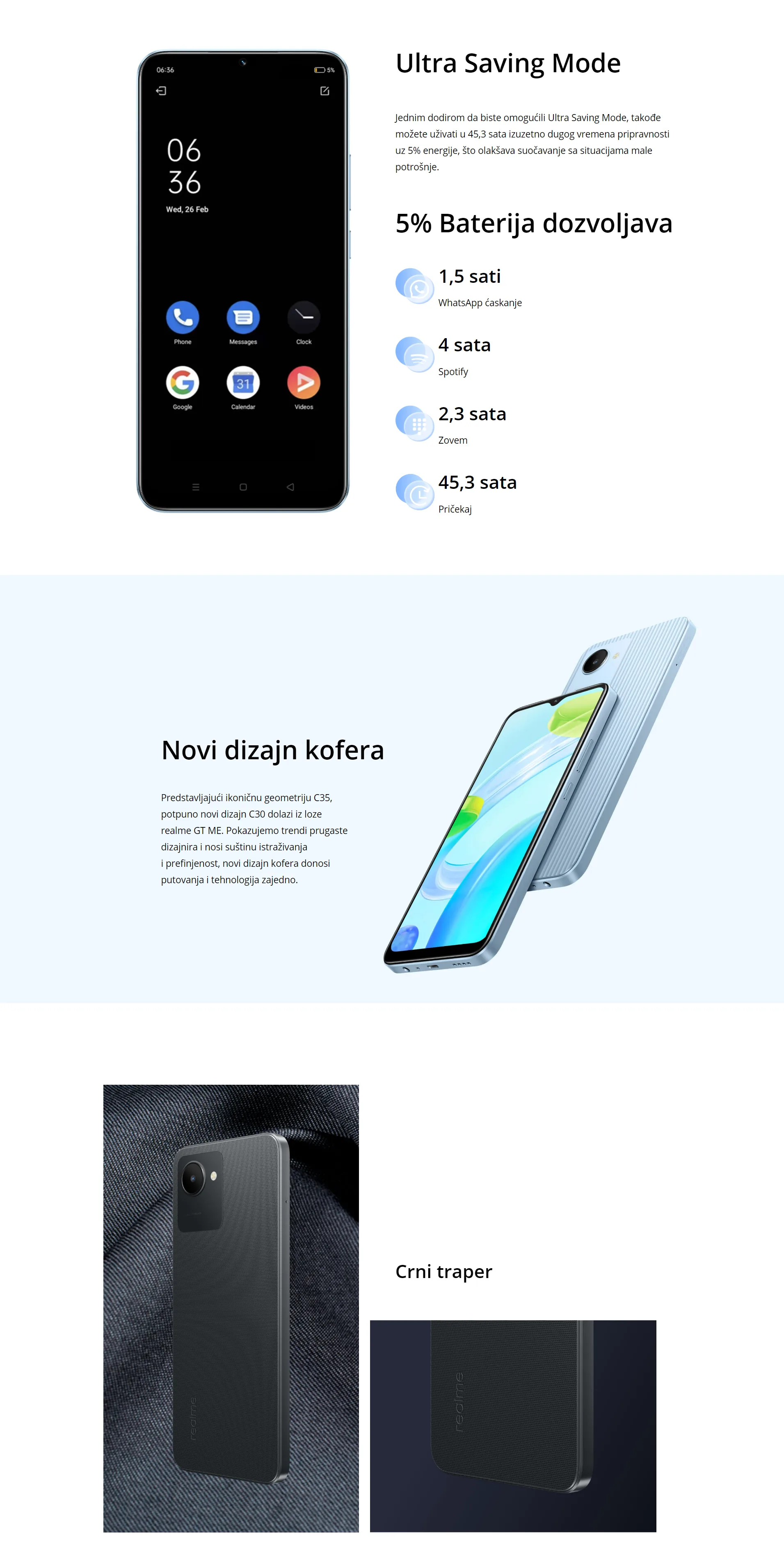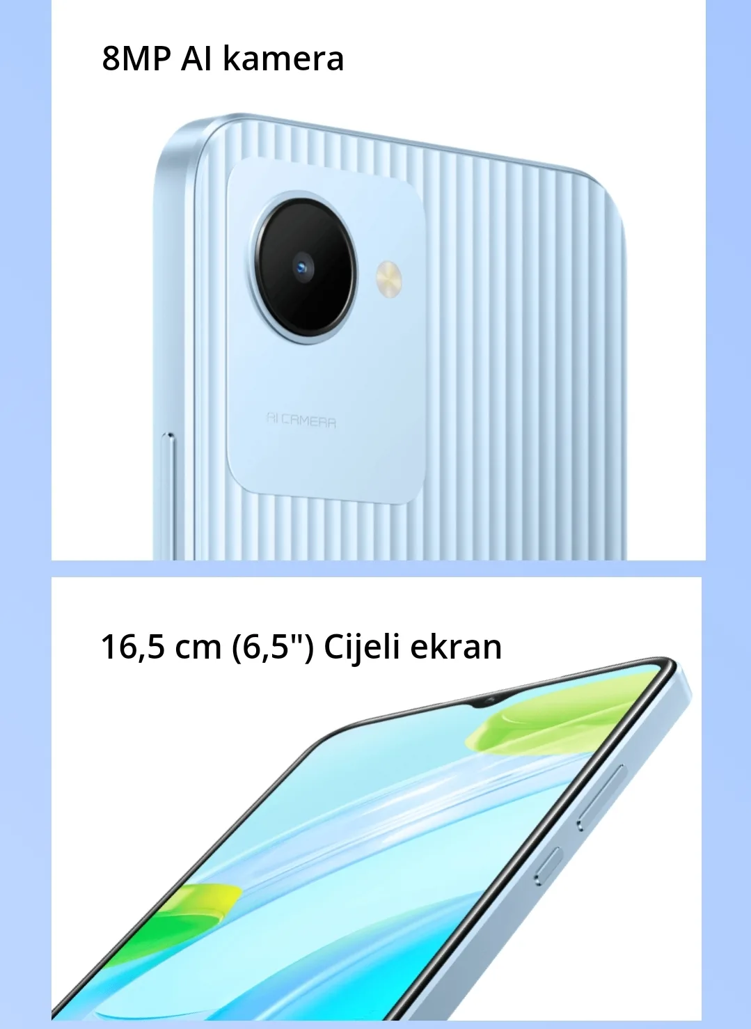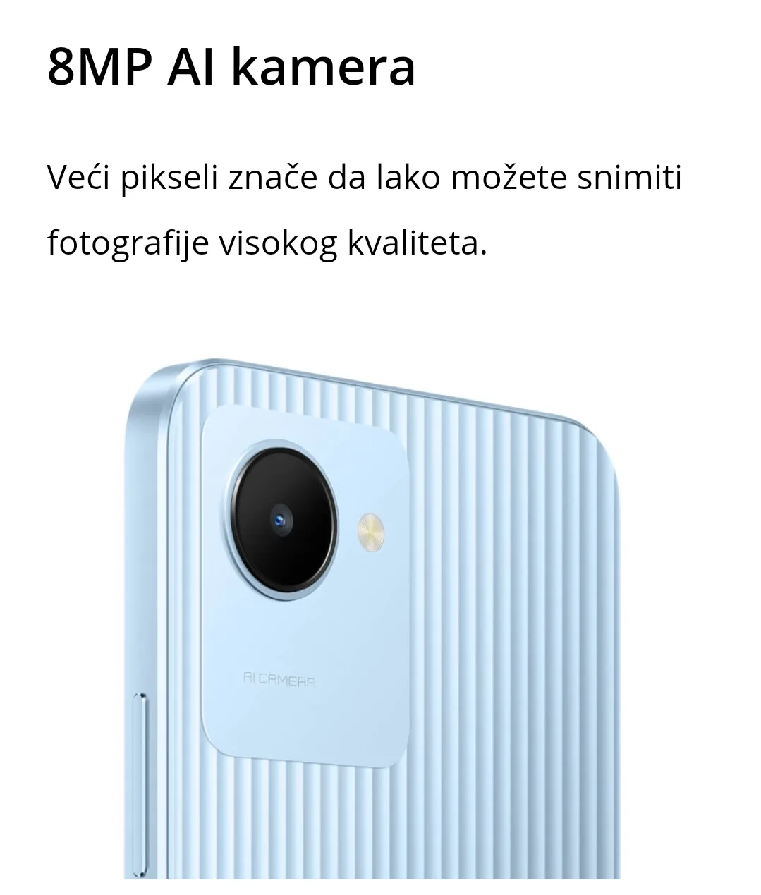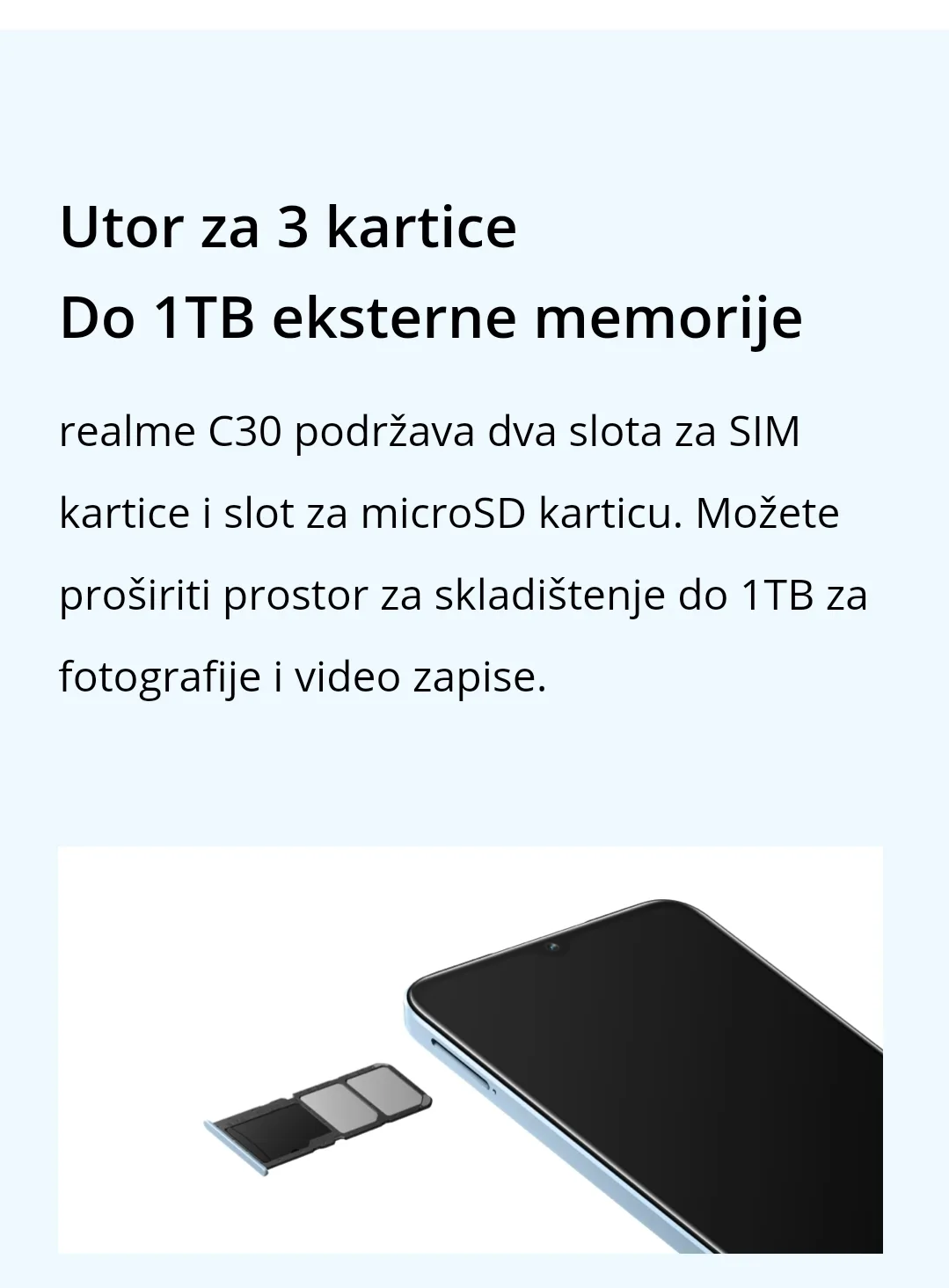 Super-izdržljiva baterija na Realme C30 omogućava vam da se suočite sa životnim izazovima. Zato što ogromna baterija od 5000 mAh lako traje ceo dan, ako ne i duže. Snažna kamera od 8 MP snima detalje briljantnog sveta. Pejzaži, portreti, makro snimci… mogućnosti su gotovo beskrajne. Veliki HD+ ekran od 6,5 inča je samo još jedan razlog više da zavolite ovaj telefon. Bilo da želite da igrate igrice ili gledate video zapise, mini DropNotch ekran preko celog ekrana nudi impresivnije iskustvo. Sa arhitekturom osmojezgra, moćni Unisoc T612 procesor uparen sa brzom DDR4Ks RAM-om za glatke performanse, čak i kada igrate igrice, bez obzira na trajanje. A interna memorija od 32 GB je takođe super brza zahvaljujući UFS2.2. Takođe se može proširiti preko microSD. Kompanija Realme se trudi da ponudi odlične telefone po najpovoljnijim cenama.