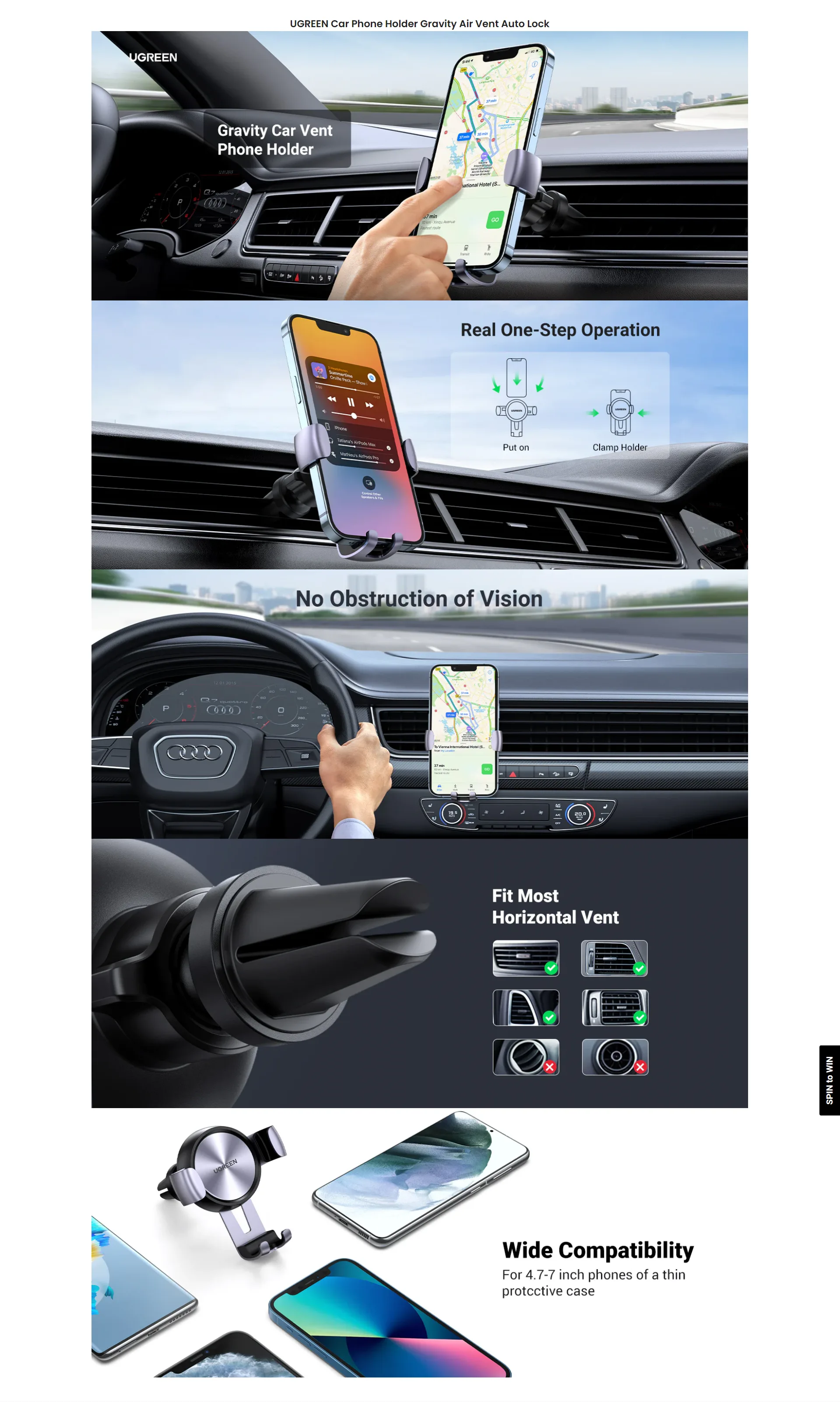 UGREEN auto držač telefona za ventilaciju LP130, namenjen je da vam olakša korišćenje telefona dok ste u vožnji. Nosač je napravljen tako da se telefon samo spusti u donji deo, a klješta koja se nalaze sa strane prilaze i osiguravaju bezbednije držanje telefona. Kompitabilan je sa svim iPhone, Samsung, Huawei, Xiaomi, Motorola, Honor i mnogim drugim proizvođačima.