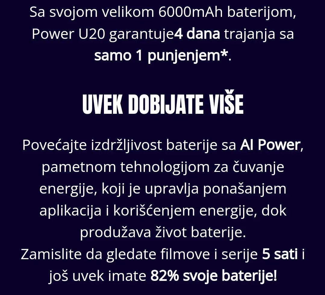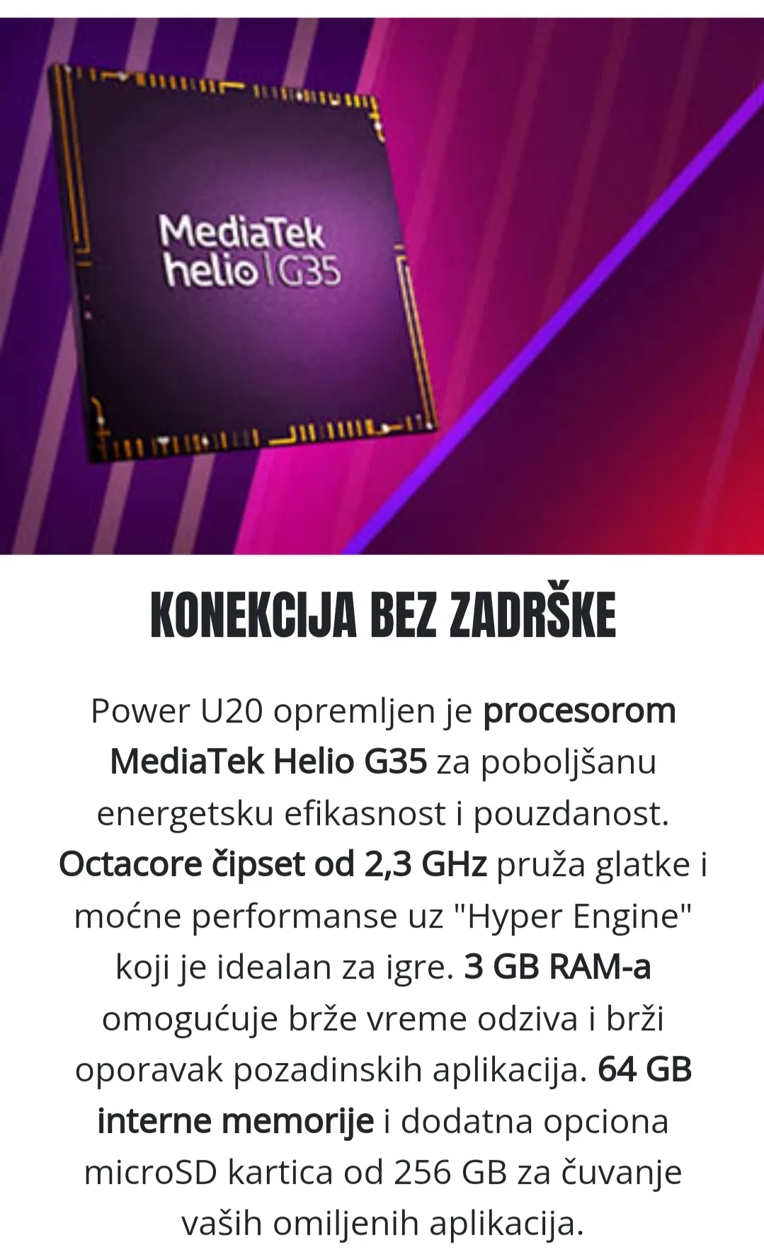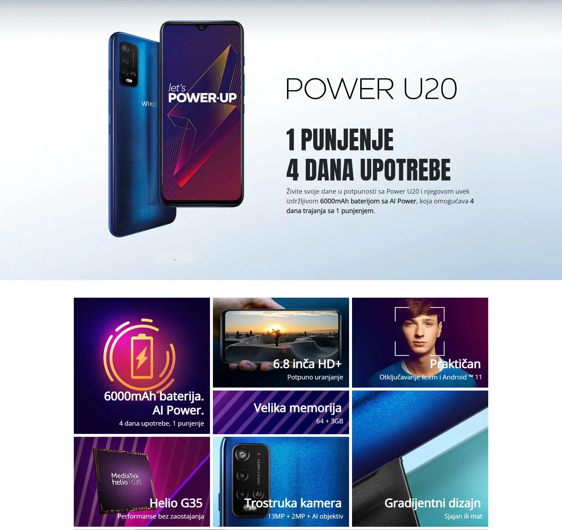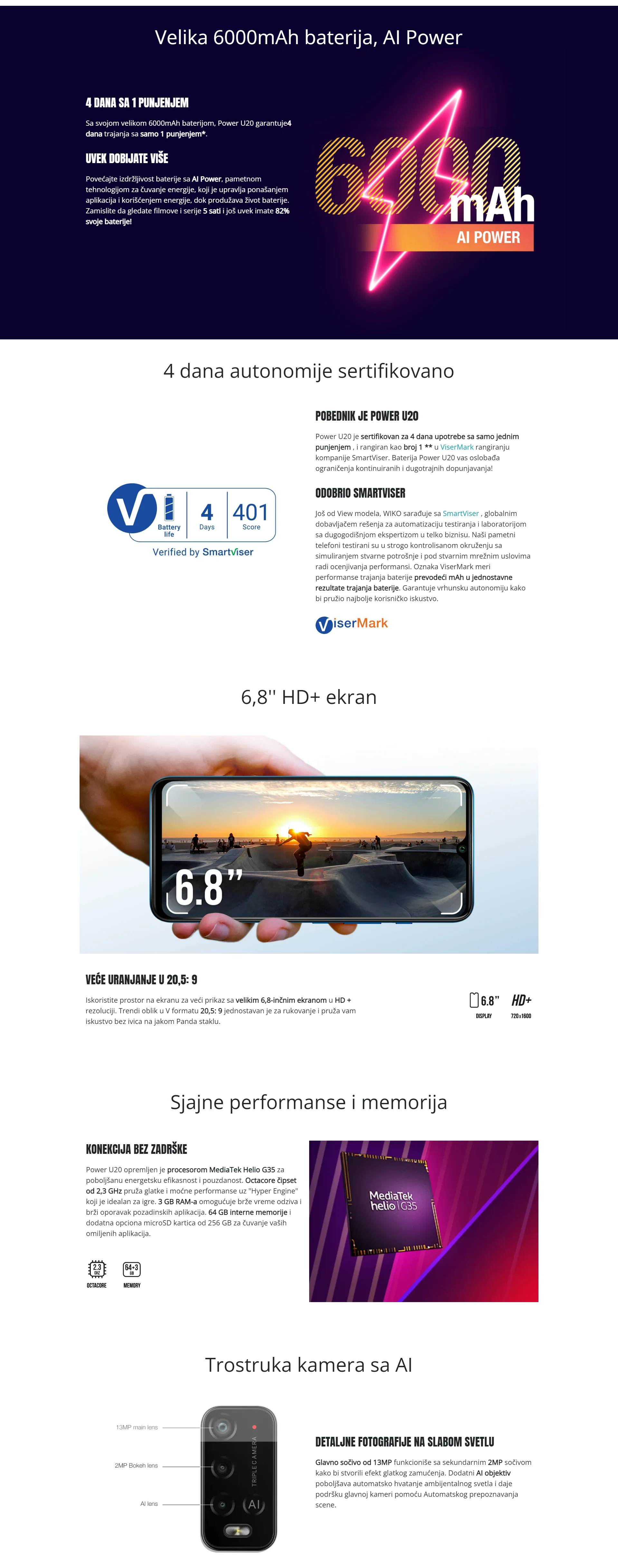 Wiko U20 3/64GB crni ima 6.82-inčni IPS LCD HD+ ekran rezolucije 720 x 1640 piksela. Telefon pokreće osmojezgarni MediaTek Helio G35 procesor. Dolazi sa 3 GB RAM-a i 64 GB interne memorije, koja se može proširiti do 256 GB putem microSD kartice.