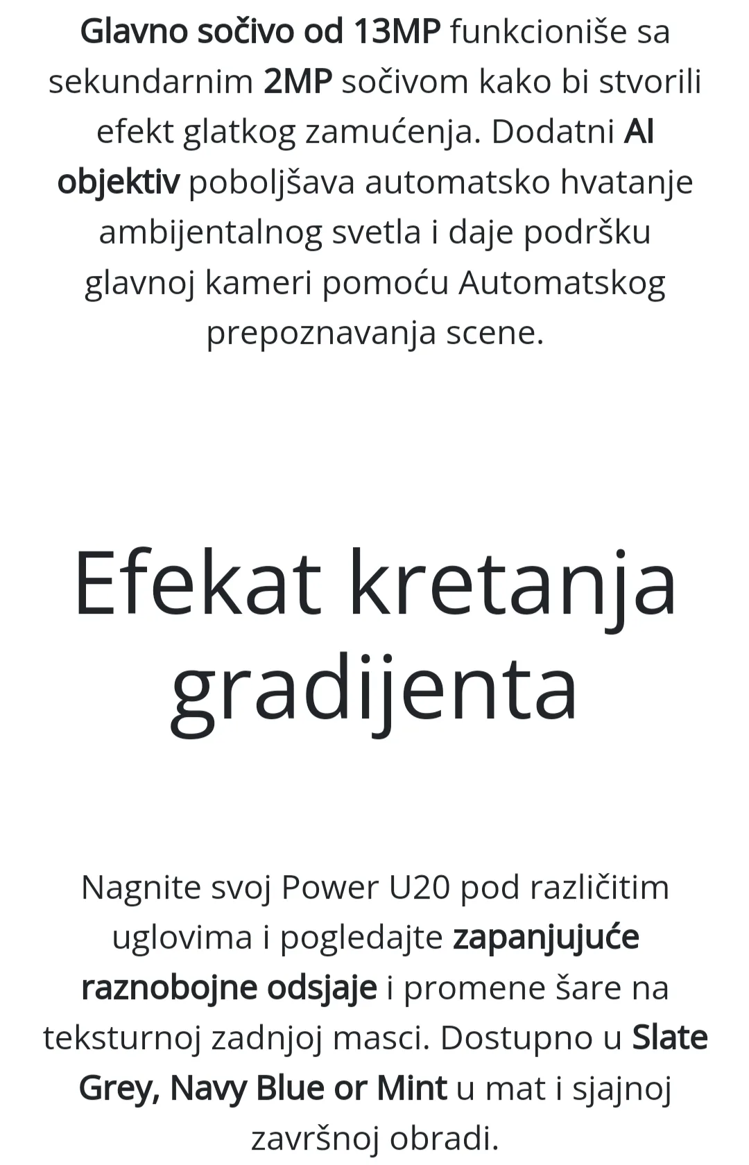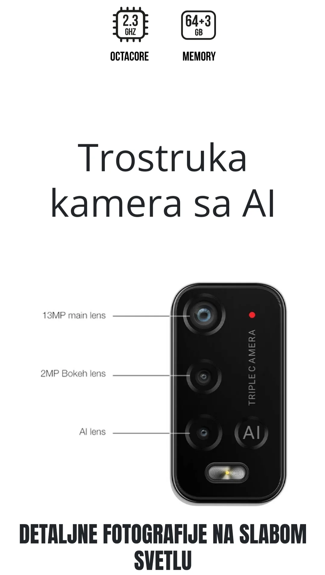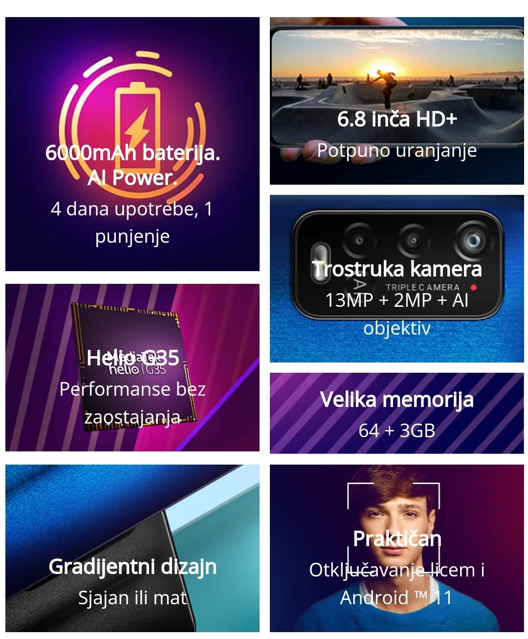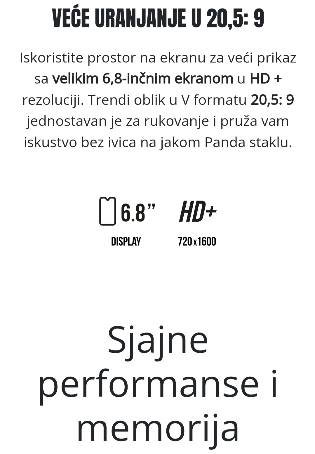 Wiko U20 3/64GB crni ima 6.82-inčni IPS LCD HD+ ekran rezolucije 720 x 1640 piksela. Telefon pokreće osmojezgarni MediaTek Helio G35 procesor. Dolazi sa 3 GB RAM-a i 64 GB interne memorije, koja se može proširiti do 256 GB putem microSD kartice.