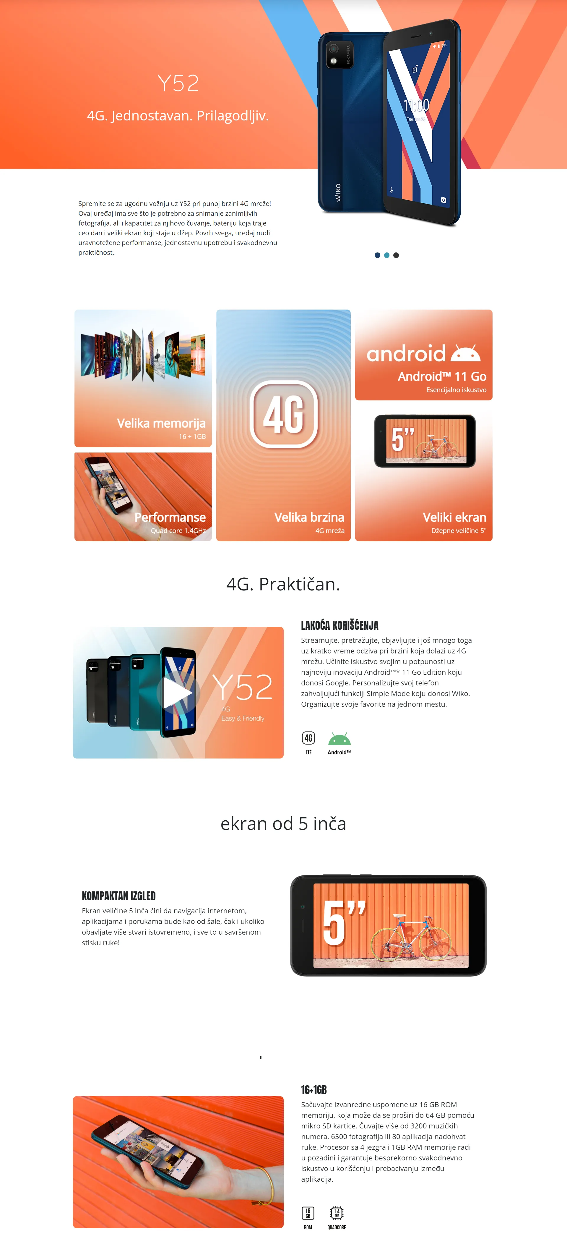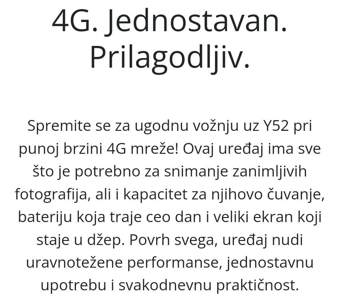 Spremite se za prijatnu vožnju uz Y52 pri punoj brzini 4G mreže! Ovaj uređaj ima sve što je potrebno za snimanje fotografija, ali i kapacitet za njihovo čuvanje. Bateriju koja traje ceo dan i veliki ekran koji staje u džep. Povrh svega, uređaj nudi uravnotežene performanse, jednostavnu upotrebu i svakodnevnu praktičnost. Učinite iskustvo svojim u potpunosti uz najnoviju inovaciju Android 11 Go Edition koju donosi Google. Ekran veličine 5 inča čini da surfovanje internetom, aplikacijama i porukama bude kao od šale, čak i ukoliko obavljate više stvari istovremeno, i sve to u savršenom stisku ruke!