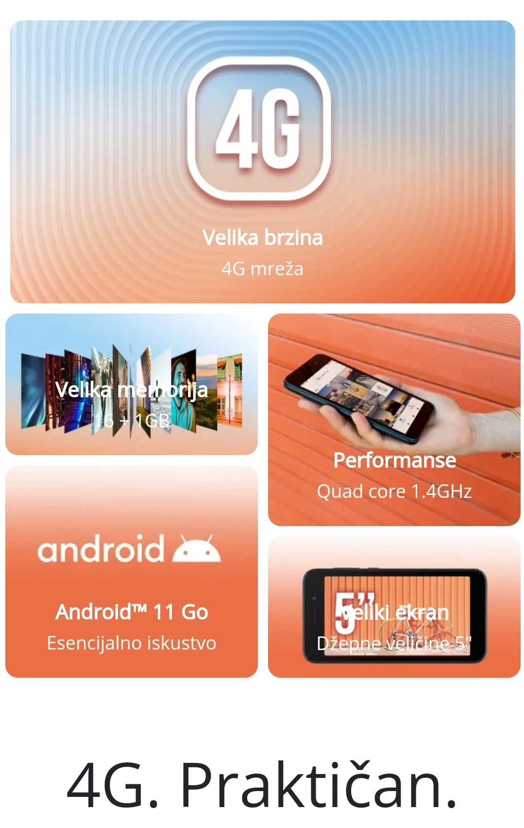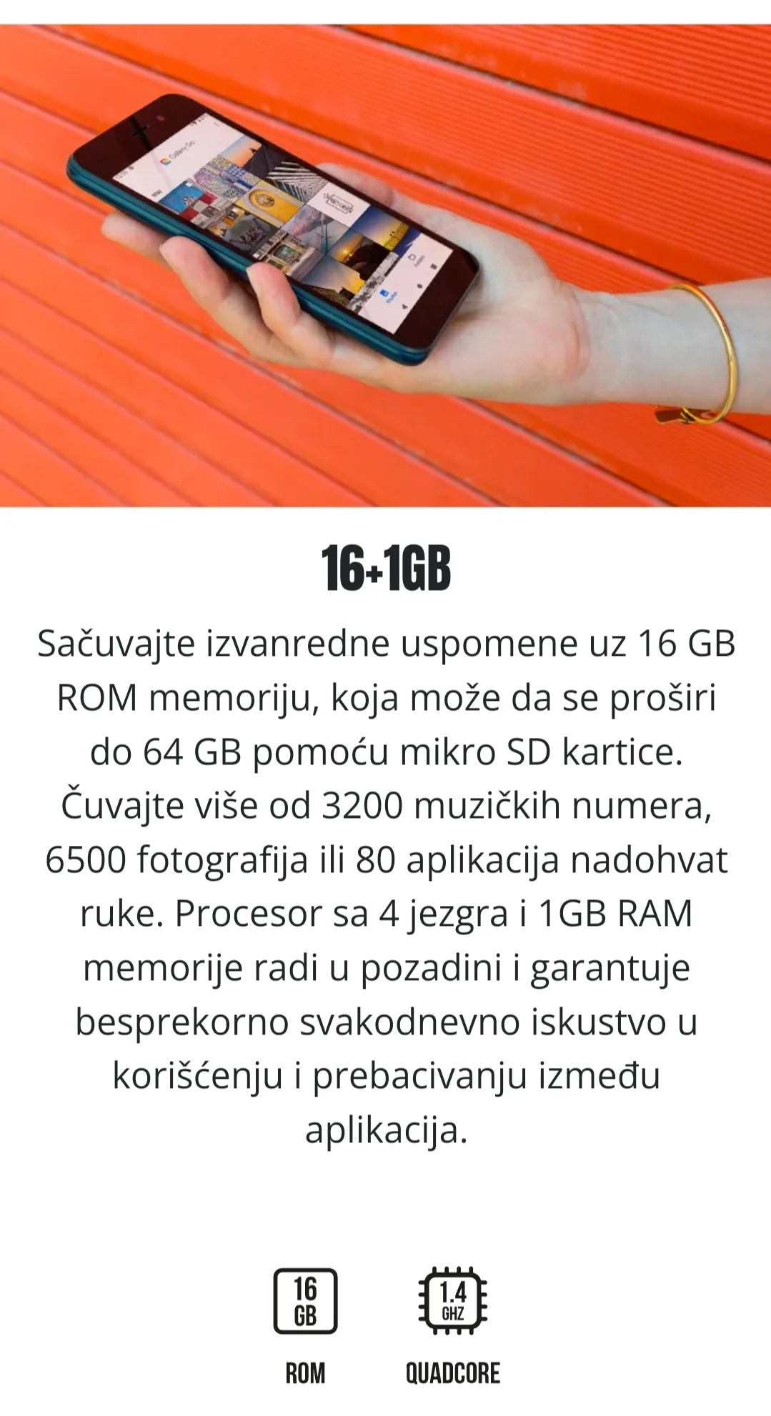 Sačuvajte svoje uspomene uz 16 GB interne memorije, koja može da se proširi do 64 GB pomoću mikro SD kartice. Procesor sa 4 jezgra i 1GB RAM memorije radi u pozadini i obezbeđuje besprekorno svakodnevno iskustvo u korišćenju i prebacivanju između aplikacija.