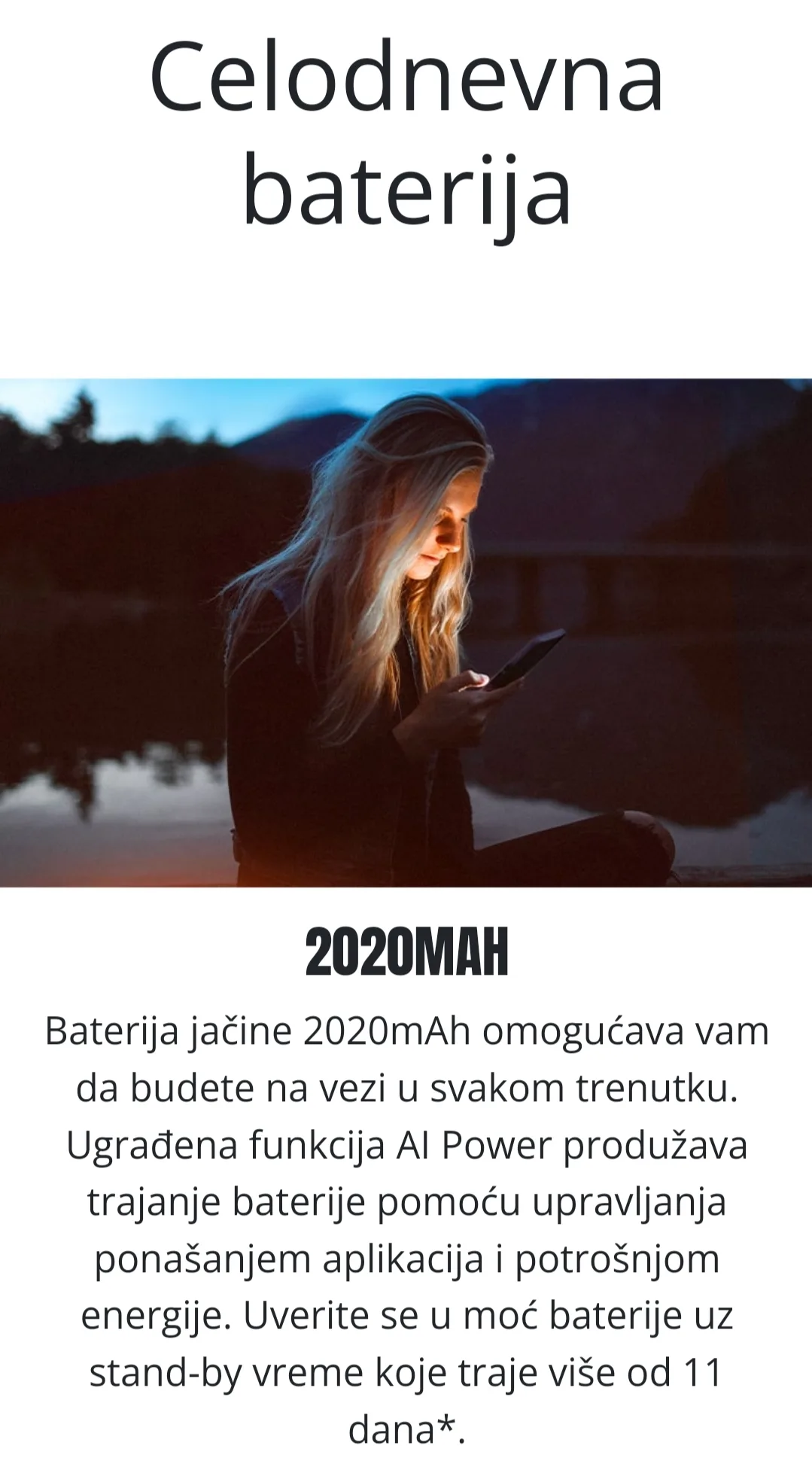 Baterija jačine 2020mAh omogućava vam da budete na vezi u svakom trenutku. Ugrađena funkcija AI Power produžava trajanje baterije pomoću upravljanja ponašanjem aplikacija i potrošnjom energije.
