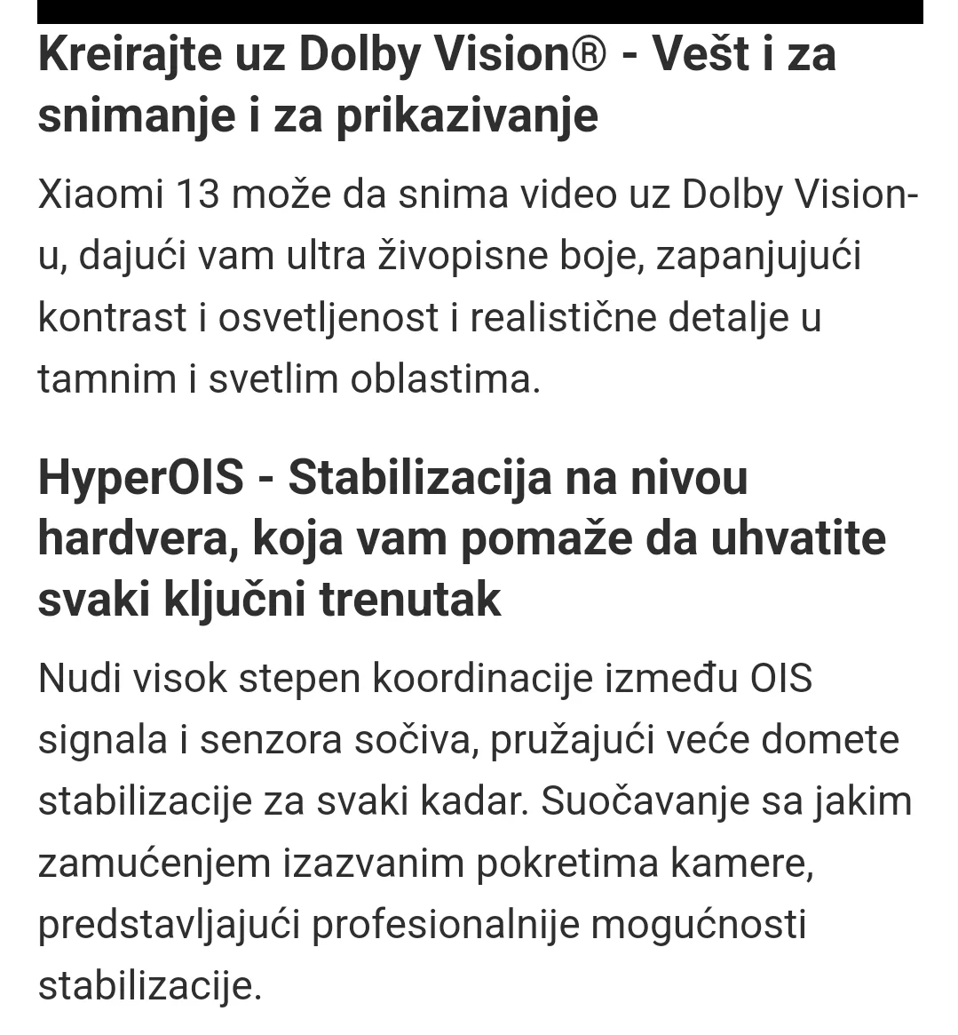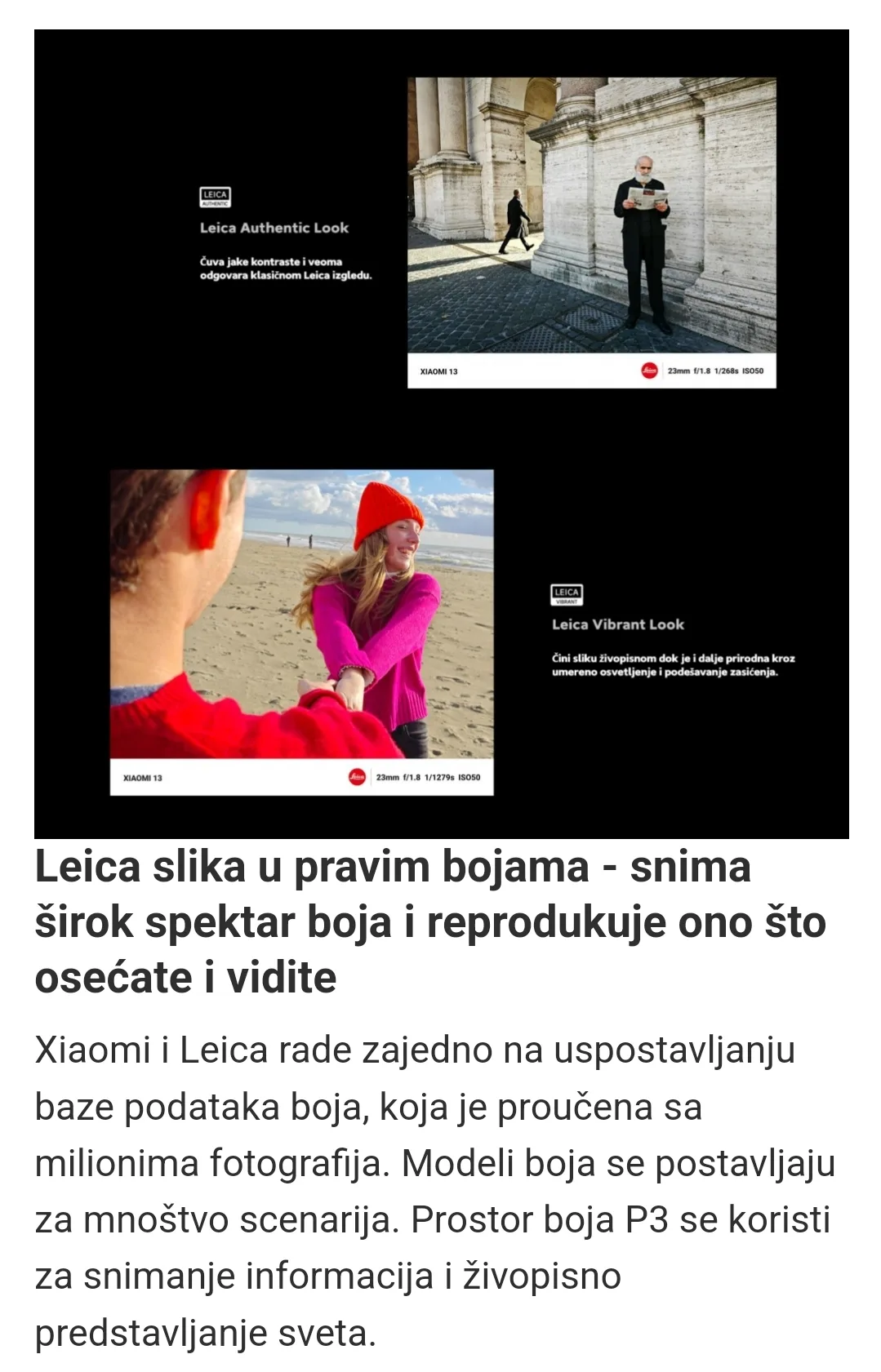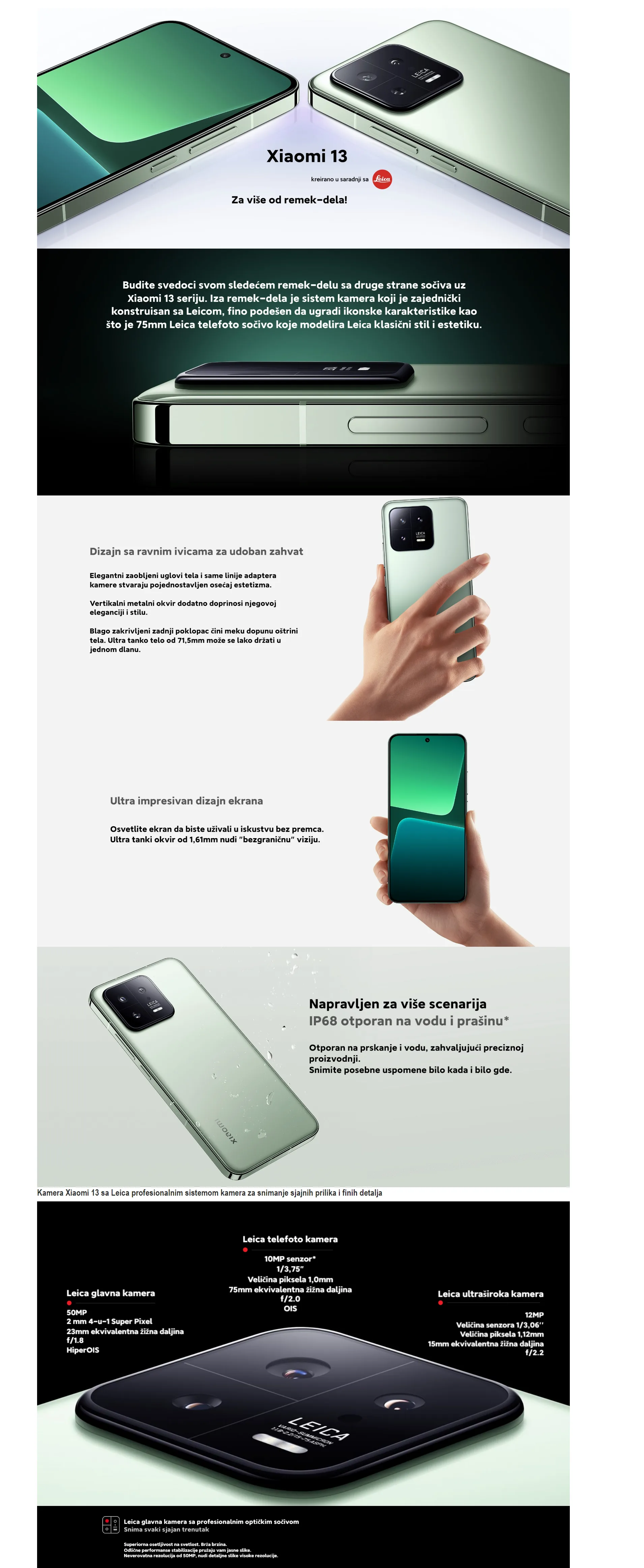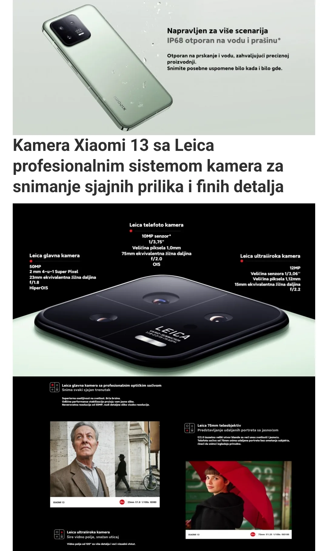 Napredne kamere na Xiaomi 13 postavljaju nove standarde u fotografiranju. Sa zadnjom kamerom od 50 megapiksela, možete uhvatiti svaki trenutak sa izvanrednom jasnoćom i detaljima. Bilo da je u pitanju panoramski pejzaž ili bliski portret, vaše fotografije će odisati profesionalnom kvalitetom.
