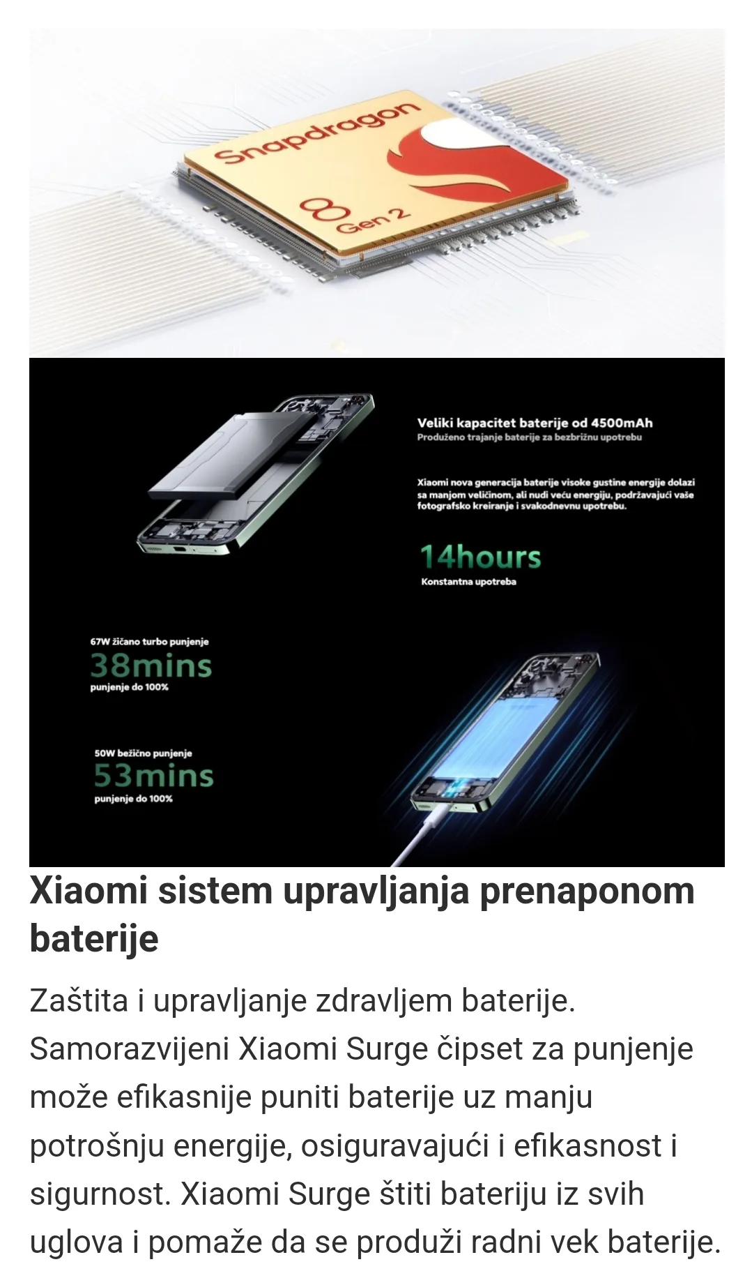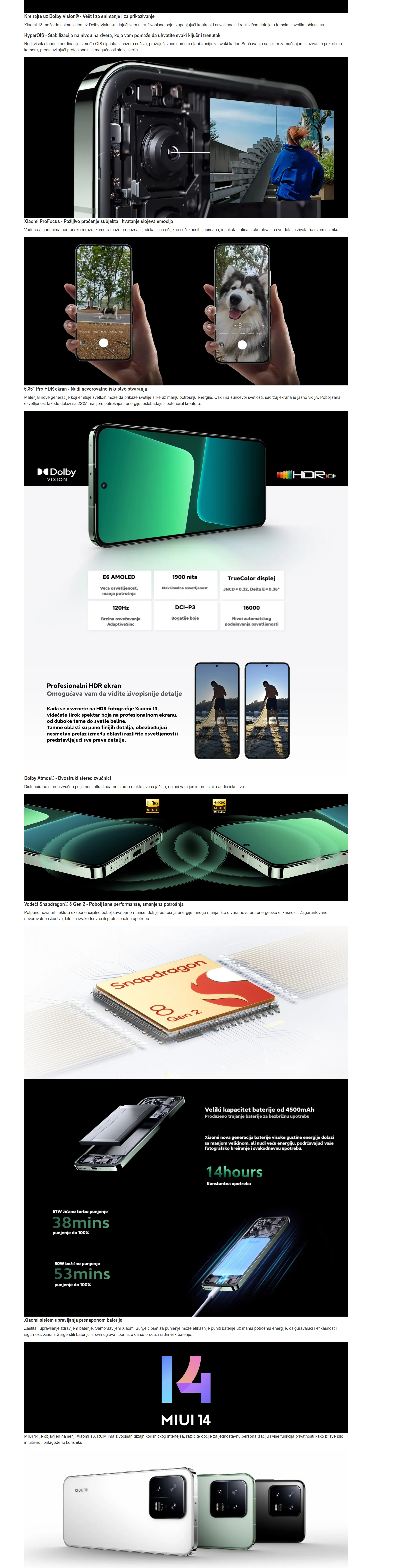 Xiaomi 13 također podržava brzo punjenje od 67W, tako da možete brzo napuniti bateriju i vratiti se svojim aktivnostima. Sa svojim interfejsom baziranim na Android operativnom sistemu, imaćete pristup brojnim aplikacijama i mogućnostima kako biste personalizovali svoje iskustvo.
