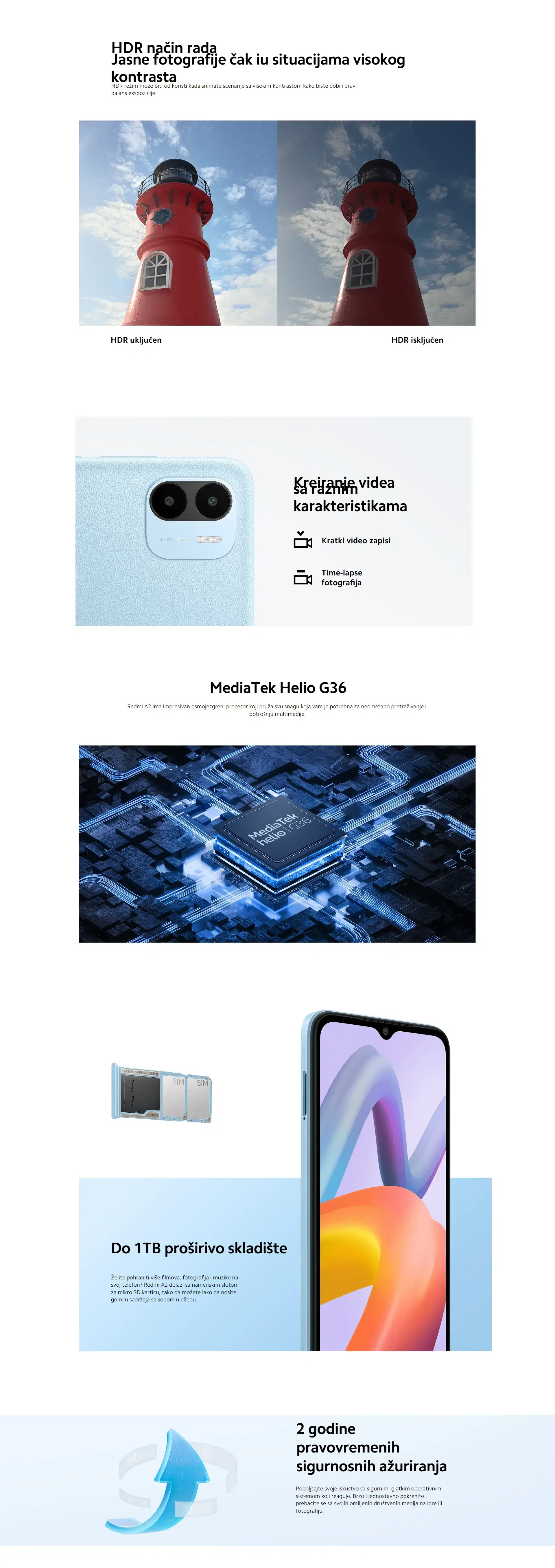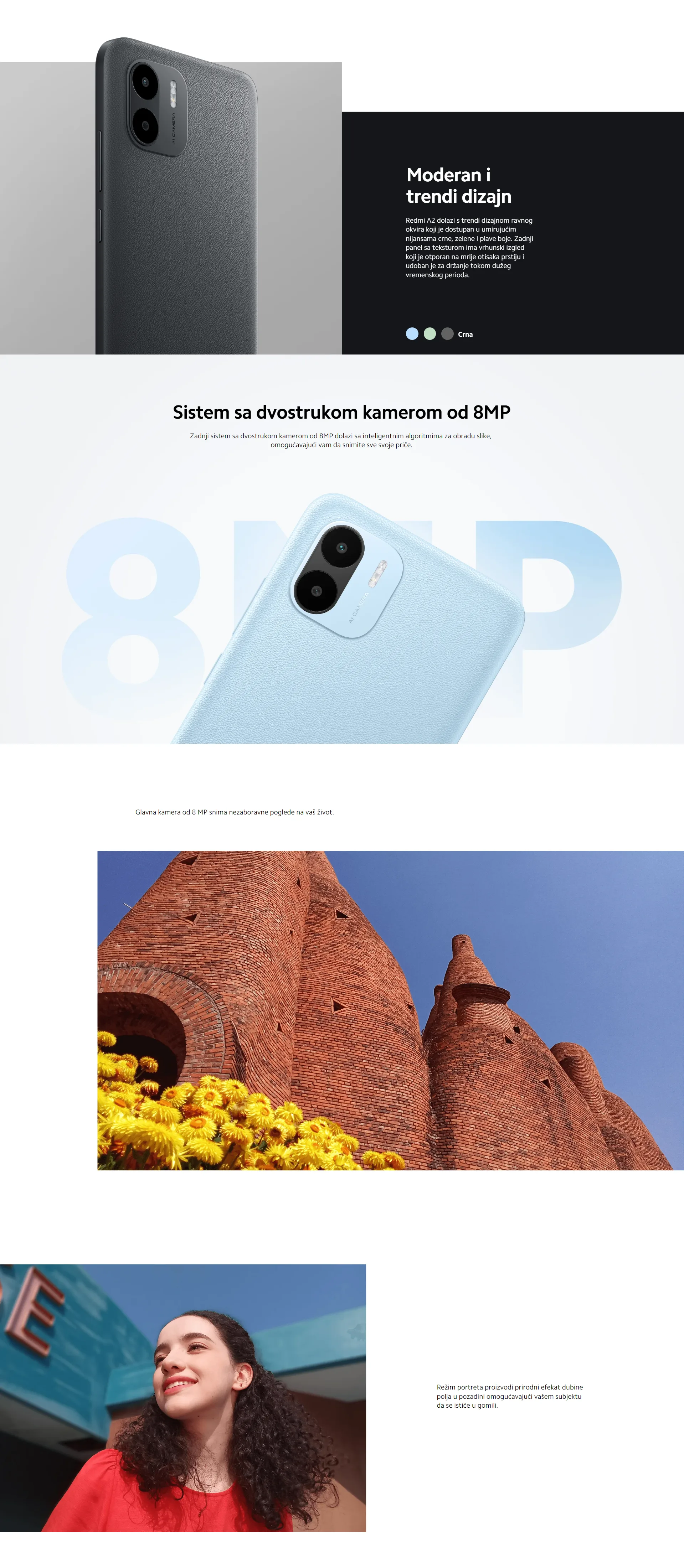 Zadnji sistem sa dvostrukom kamerom od 8 MP ima inteligentne algoritme za obradu slike koji se mogu koristiti za snimanje svih priča. Glavna kamera od 8 megapiksela beleži nezaboravne trenutke života, a režim portreta stvara prirodni efekat dubine polja u pozadini, čineći da se subjekt lepo ističe. HDR režim može biti veoma koristan kada snimate u situacijama visokog kontrasta kako biste postigli pravi balans ekspozicije. Ima mogućnost proširenja memorije tako da uvek imate dovoljno prostora za mnoštvo sadržaja. Xiaomi Redmi A2 2/32GB Crni je svakako jedan od boljih izbora u ovoj cenovnoj klasi kojoj pripada.