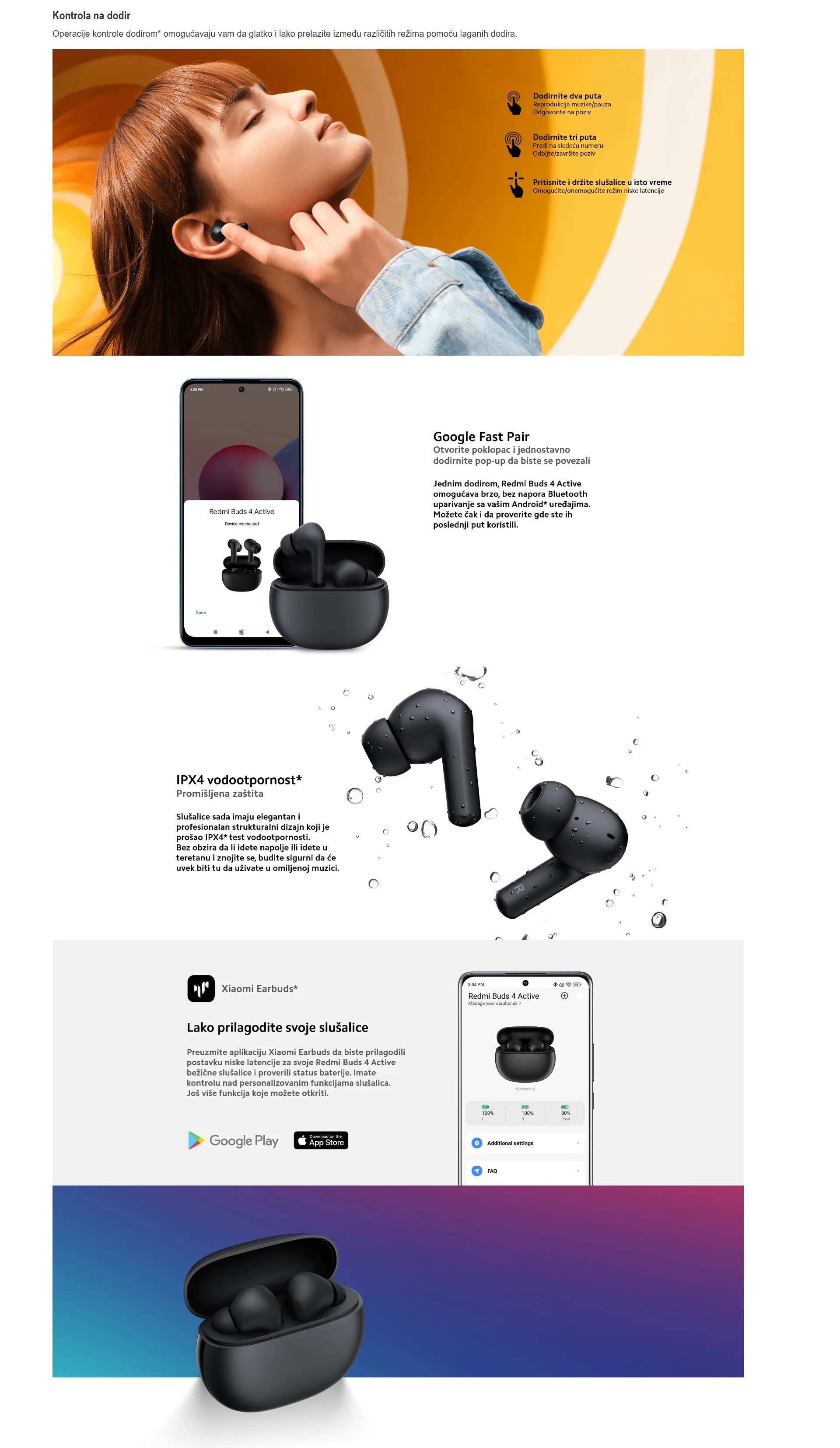 Opremljene sa aktivnim poništavanjem buke (ANC) za pozive, Redmi Buds 4 omogućavaju kristalno čiste pozive bez obzira na okolnu buku. Vodootporne sa standardom IP4X, idealne su za sve vrste sportova, dok TWS (True Wireless Stereo) tehnologija obećava izvanredno iskustvo slušanja bez komplikacija sa kablovima.