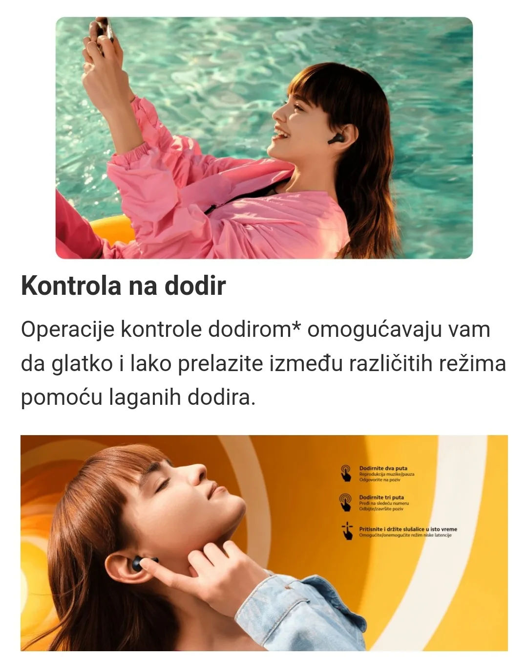 Intuitivne kontrole na dodir omogućavaju jednostavno upravljanje muzikom i pozivima. Dvostruki i trostruki dodiri, kao i dugotrajno pritiskanje, su sve što vam je potrebno za navigaciju kroz vaš audio svet.