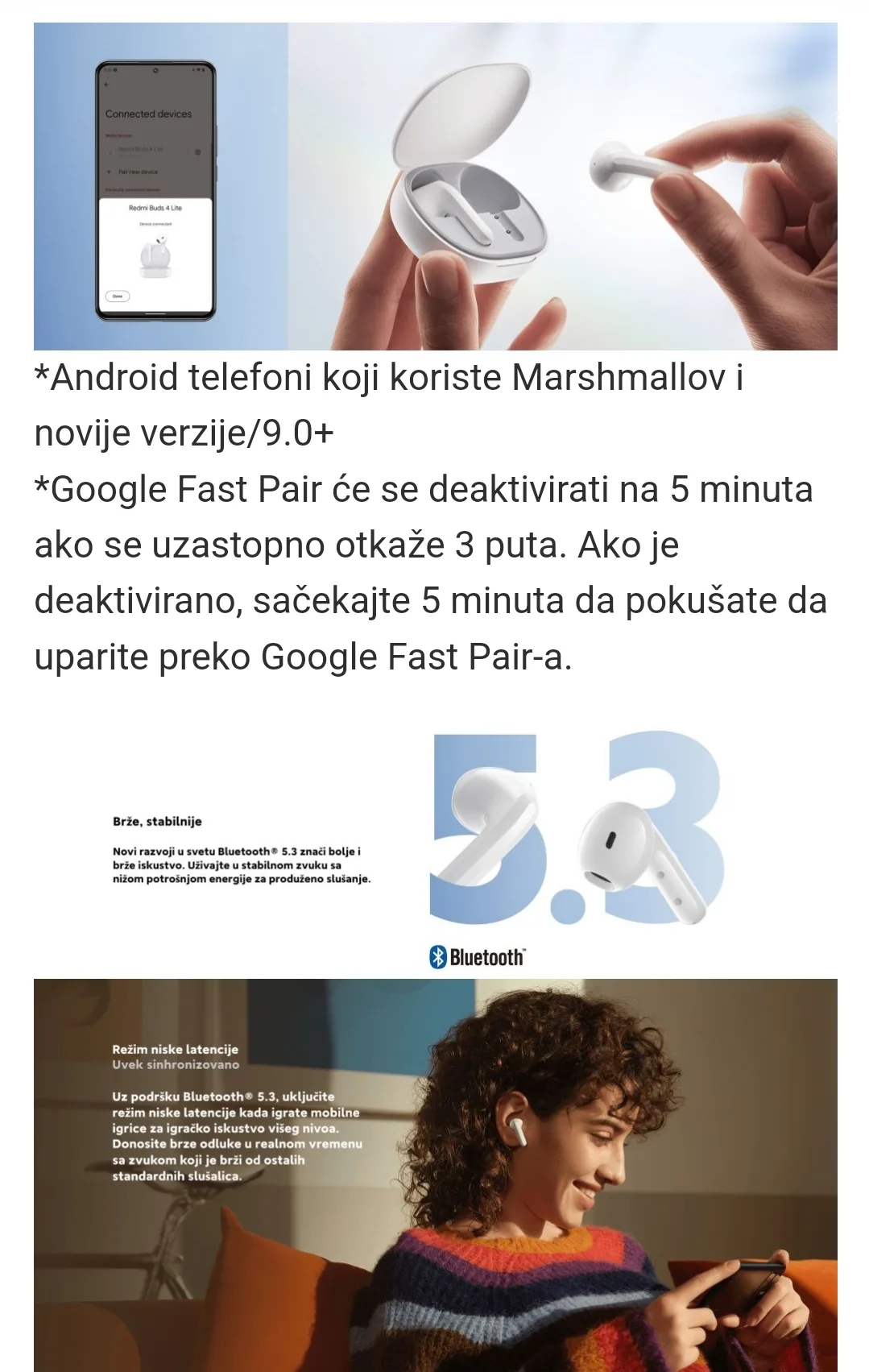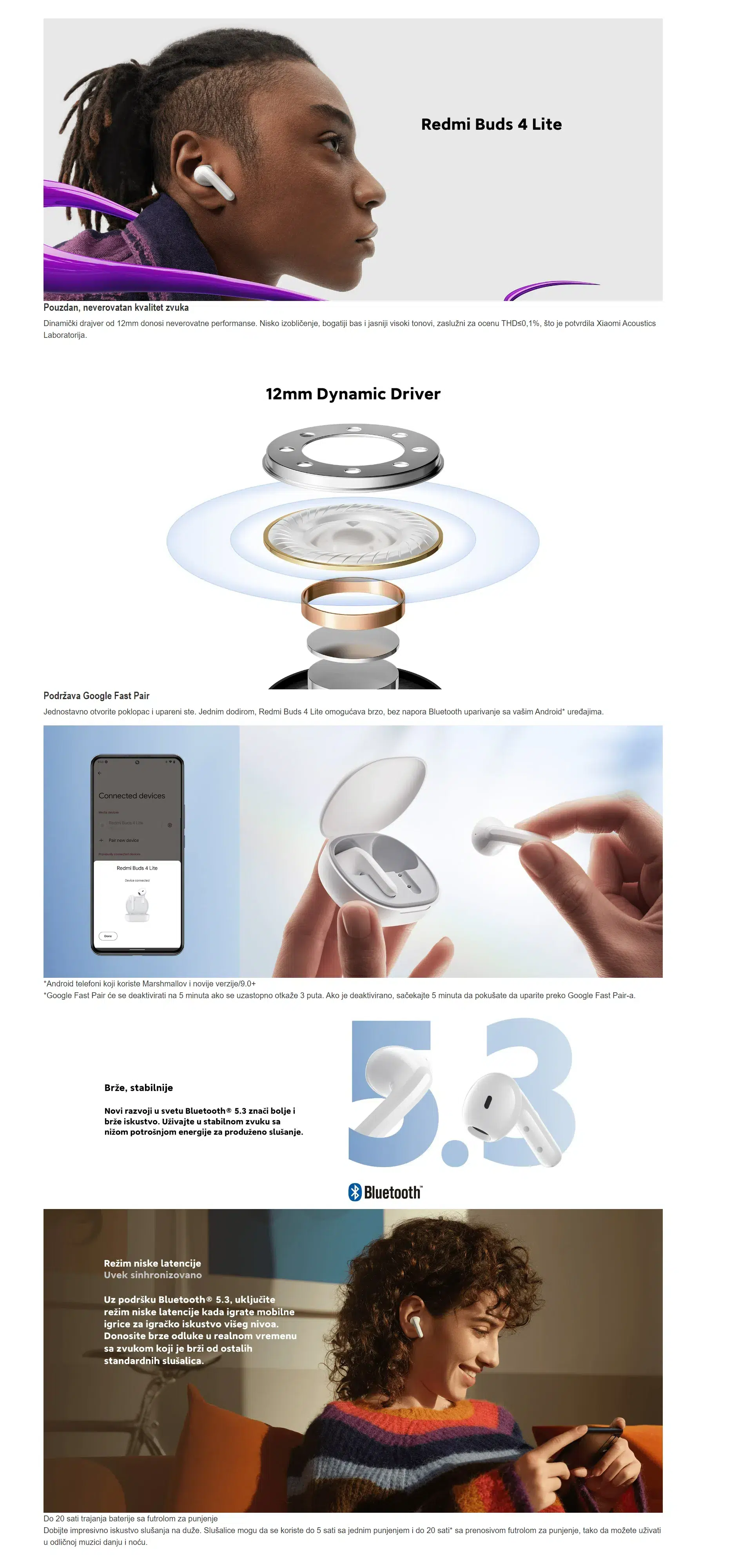 Mogu se povezati brzo i bez napora preko Bluetooth-a samo jednim dodirom prsta i osigurati prvoklasno iskustvo igranja mobilnih igara zahvaljujući malom kašnjenju. Dinamički drajveri od 12 mm pružaju impresivne performanse, nisku distorziju, bogatiji bas i jasnije visoke tonove.
