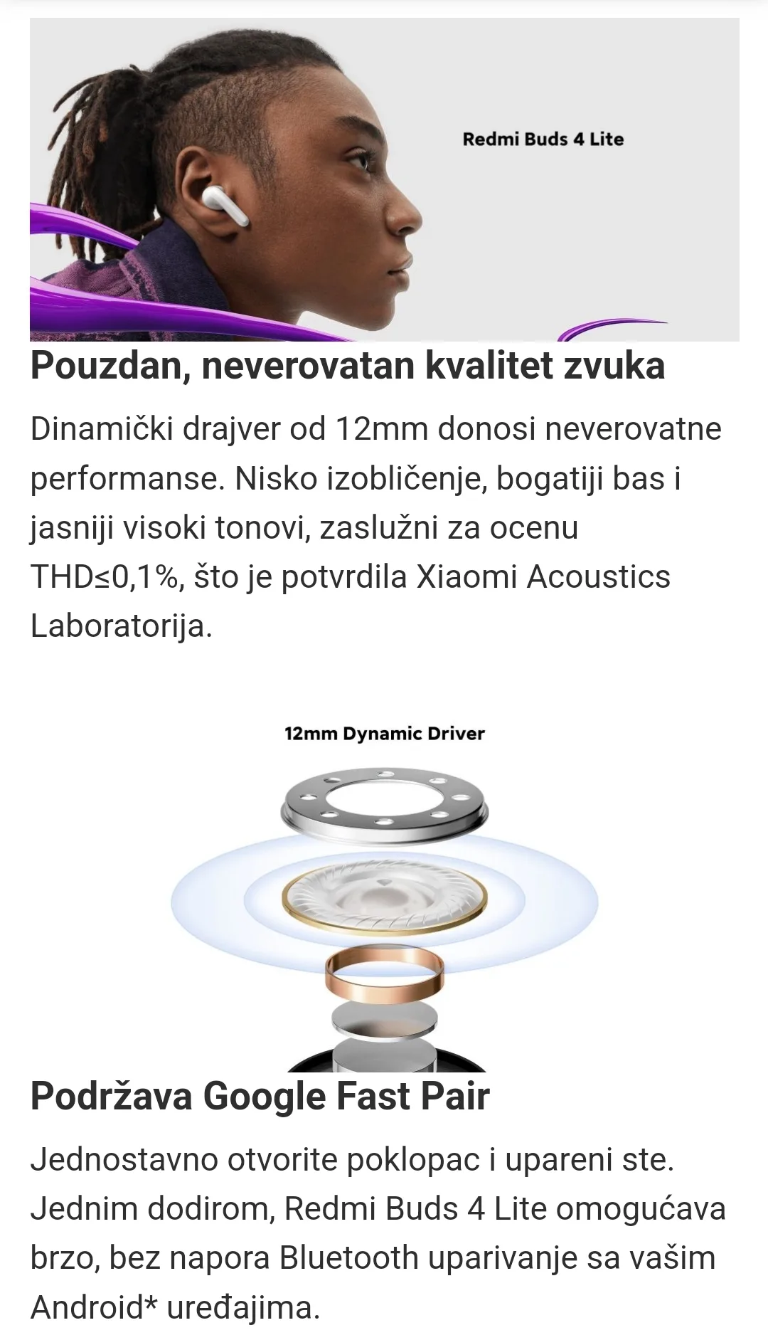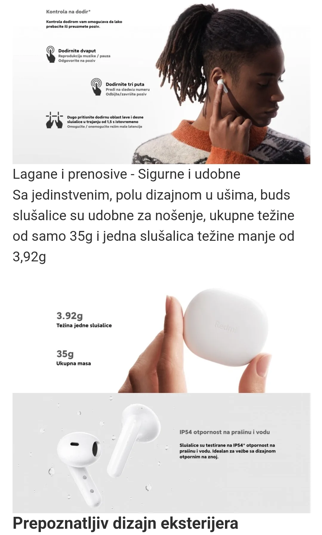 Redmi Buds 4 Lite brenda Xiaomi odlikuje ergonomski dizajn koji daje udobnost i komfor. Kada trčite ili vežbate, one se bezbedno drže u ušima.