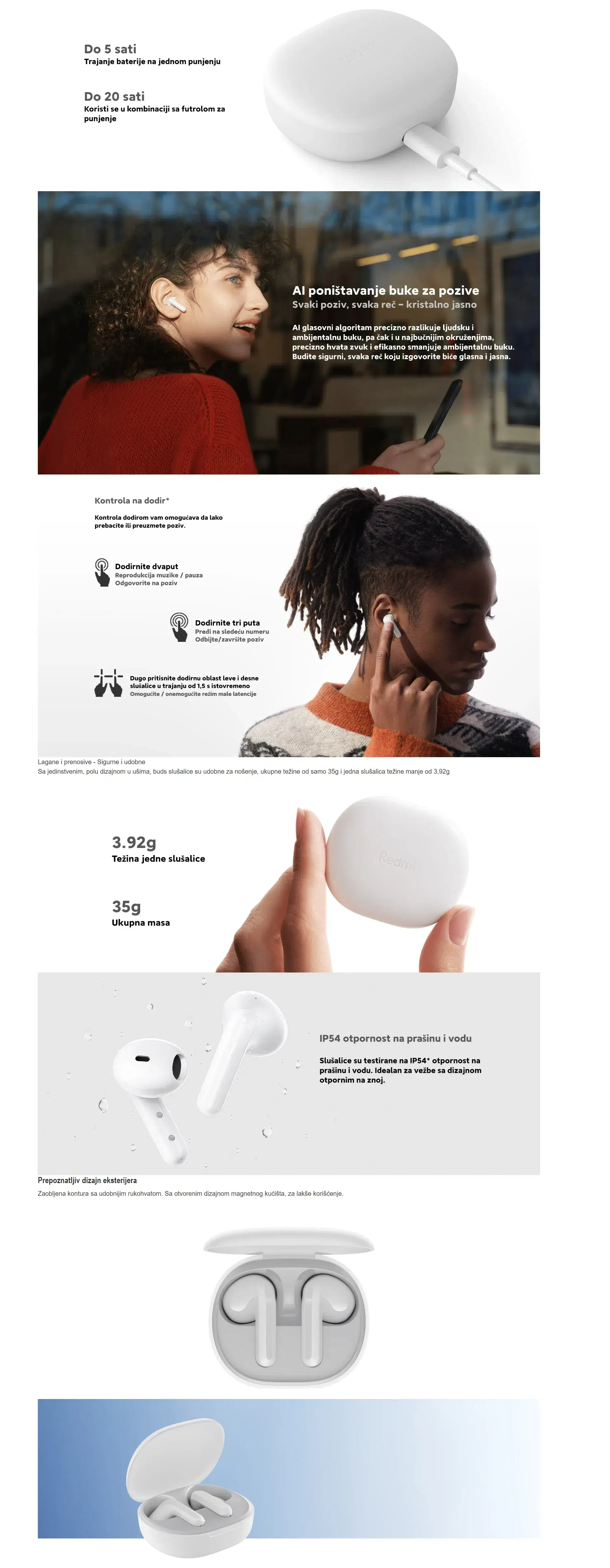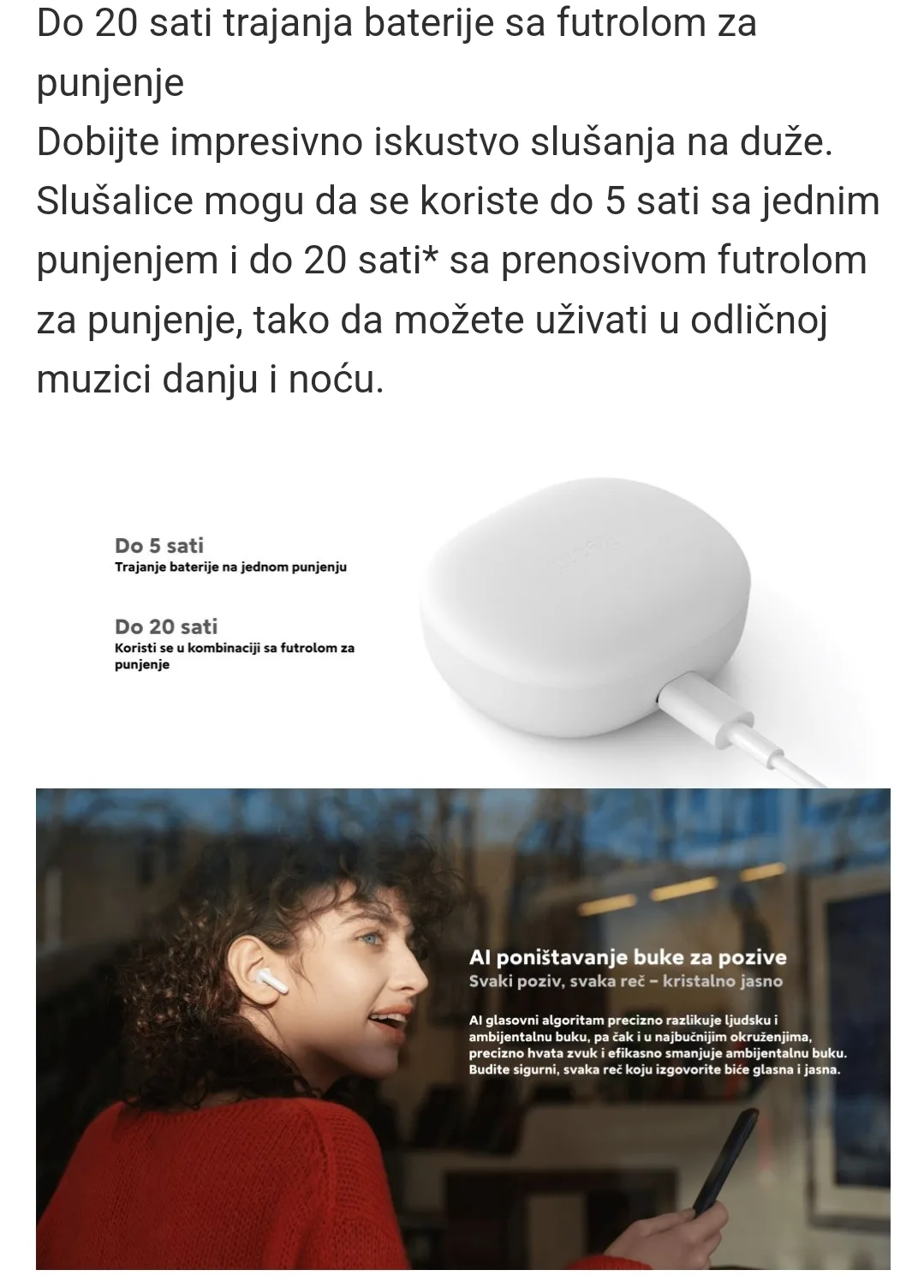 Slušalice mogu da se koriste do 5 sati sa jednim punjenjem i do 20 sati sa prenosivom futrolom za punjenje. Tako da možete uživati u muzici dan i noć. Algoritam AI govora precizno razlikuje ljudsku i pozadinsku buku, tako da se čak i u najbučnijim okruženjima audio signali precizno hvataju, a pozadinska buka se efikasno smanjuje.