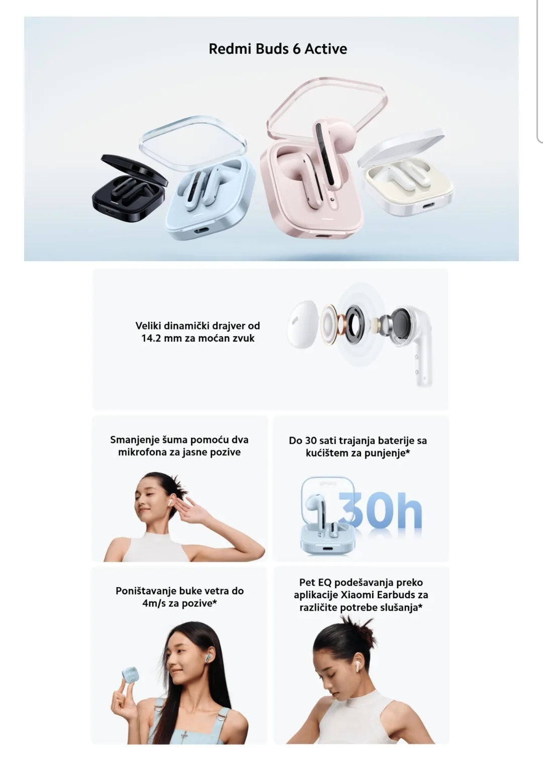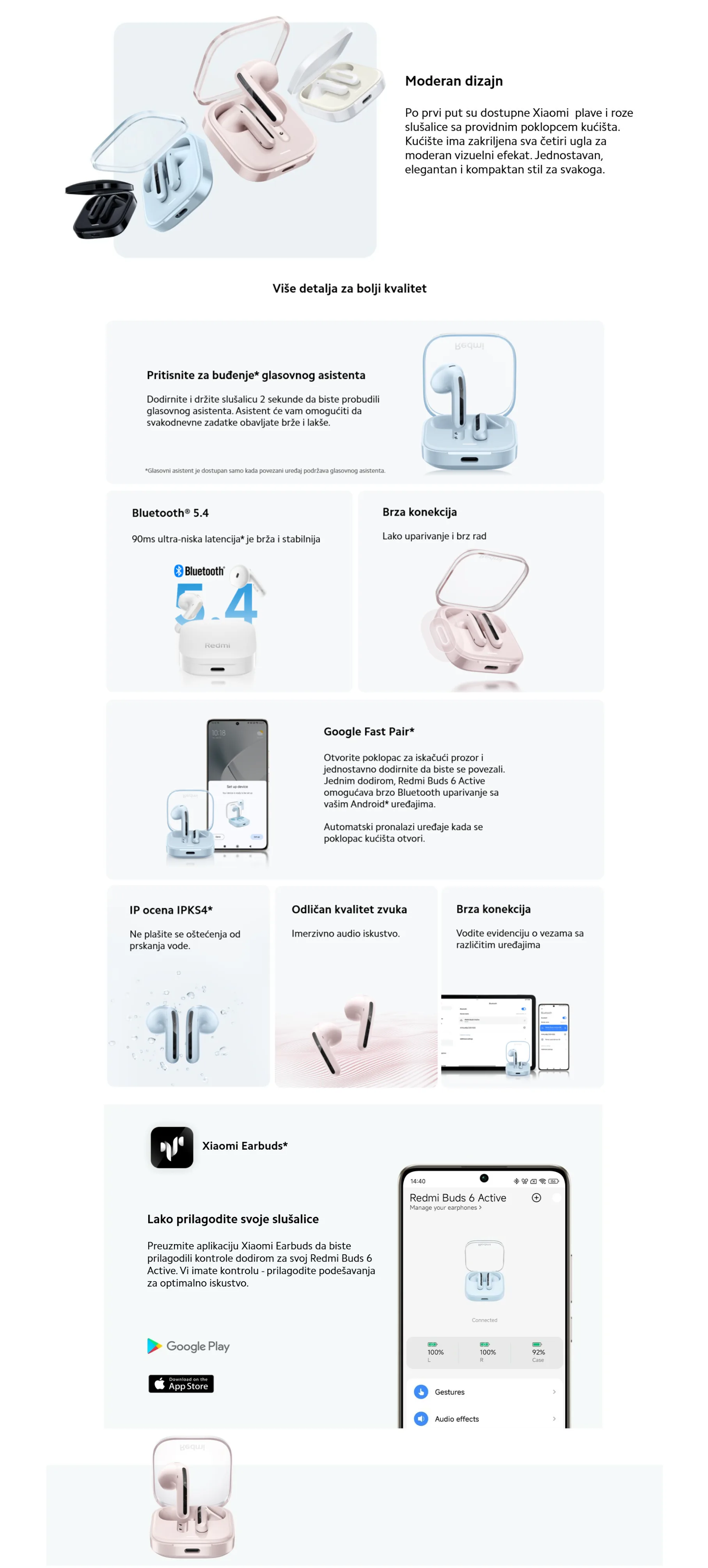 Redmi Buds 6 Active su savršene bežične Xiaomi slušalice za one koji cene kvalitet zvuka, udobnost i dugotrajnost baterije. Sa modernim funkcijama kao što su dugotrajna autonomija, otpornost na vodu i najnovija Bluetooth tehnologija, ove slušalice su dizajnirane da zadovolje potrebe modernog korisnika. Bilo da ih koristite za posao, rekreaciju ili slobodno vreme, Redmi Buds 6 Active pružaju izvanredno iskustvo u svakom trenutku. Ne propustite priliku da ih dodate u svoju kolekciju i uživate u vrhunskoj zvučnoj performansi sa najboljim Xiaomi Redmi slušalicama!