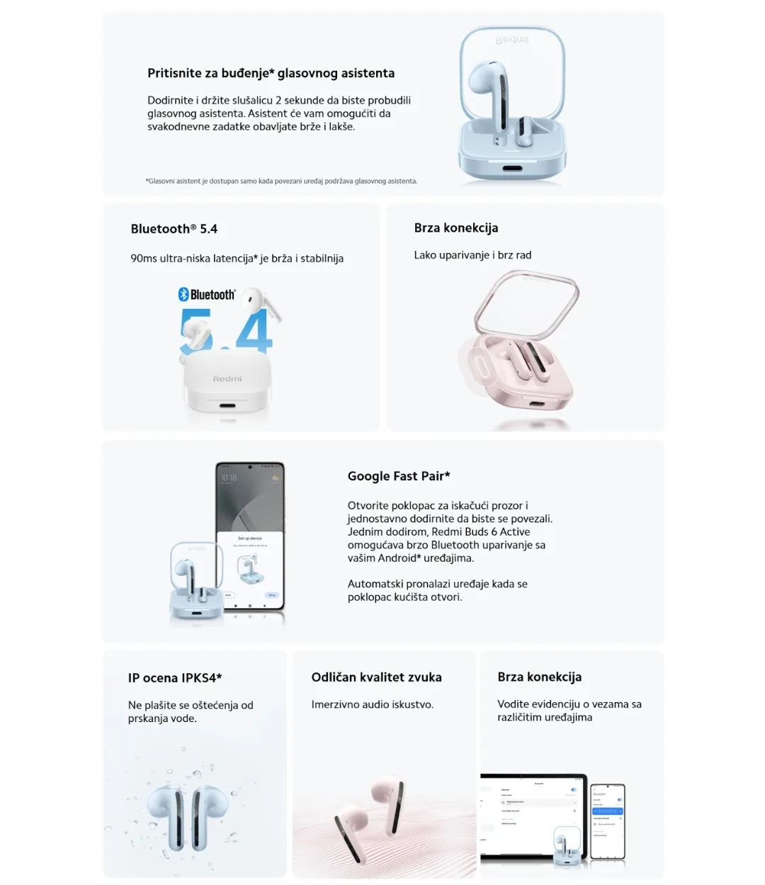 Redmi Buds 6 Active dolaze sa IPX4 sertifikatom otpornosti na vodu, što ih čini savršenim saputnicima za treninge, šetnje po kiši ili druge aktivnosti na otvorenom. Ove Xiaomi slušalice su dizajnirane da izdrže znoj i kišne kapi, pružajući vam pouzdanu funkcionalnost bez obzira na uslove.