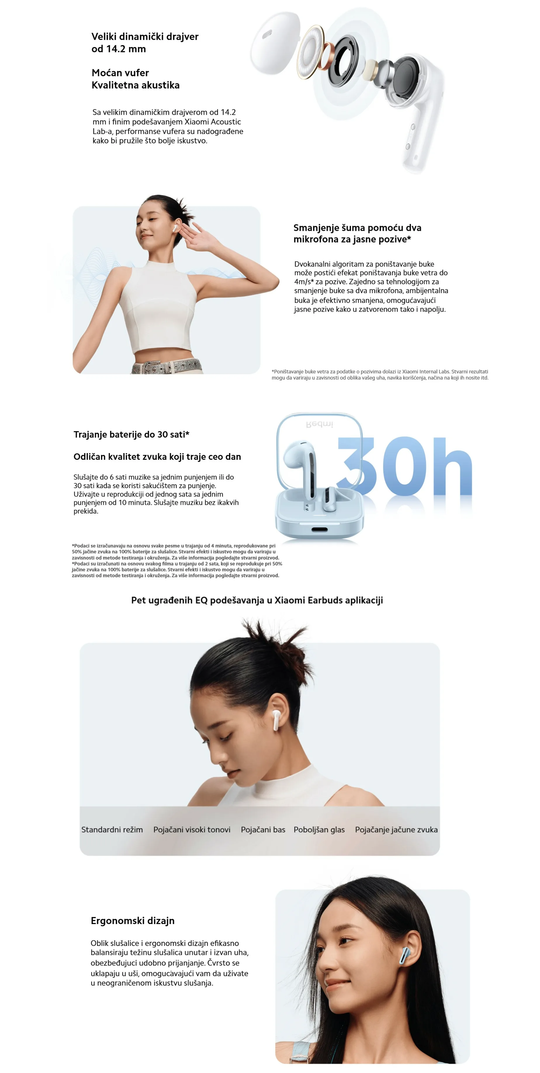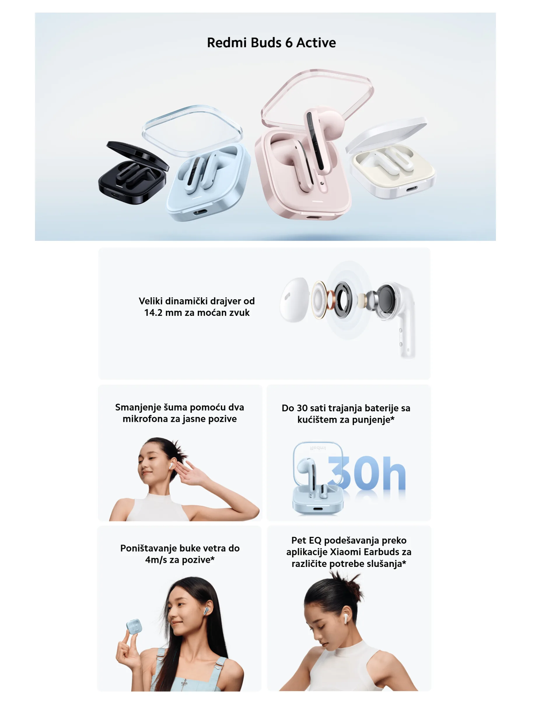 Jedna od najvažnijih prednosti Redmi Buds 6 Active slušalica je njihova neverovatna autonomija. Sa samo jednim punjenjem, uživaćete u do 30 sati slušanja muzike ili obavljanja poziva, zahvaljujući kutiji za punjenje koja obezbeđuje dodatnu energiju kada je to potrebno. Bez obzira da li ste na putu ili u kancelariji, ove povoljne Xiaomi slušalice vas neće izneveriti.