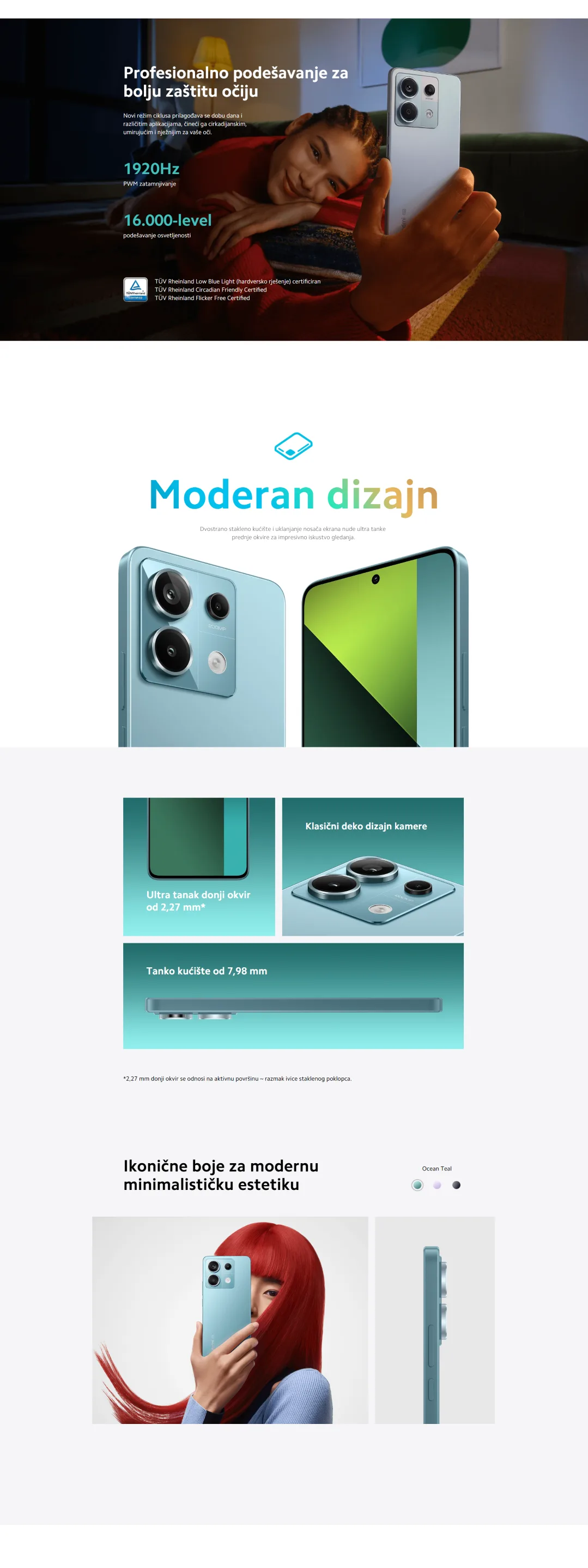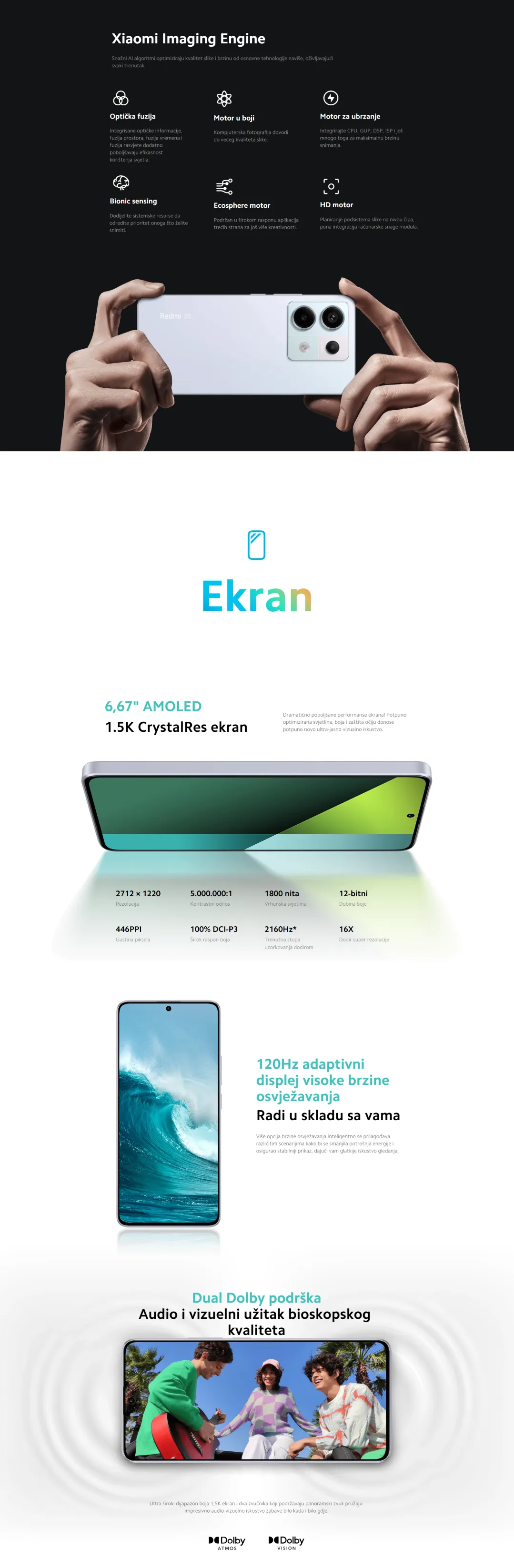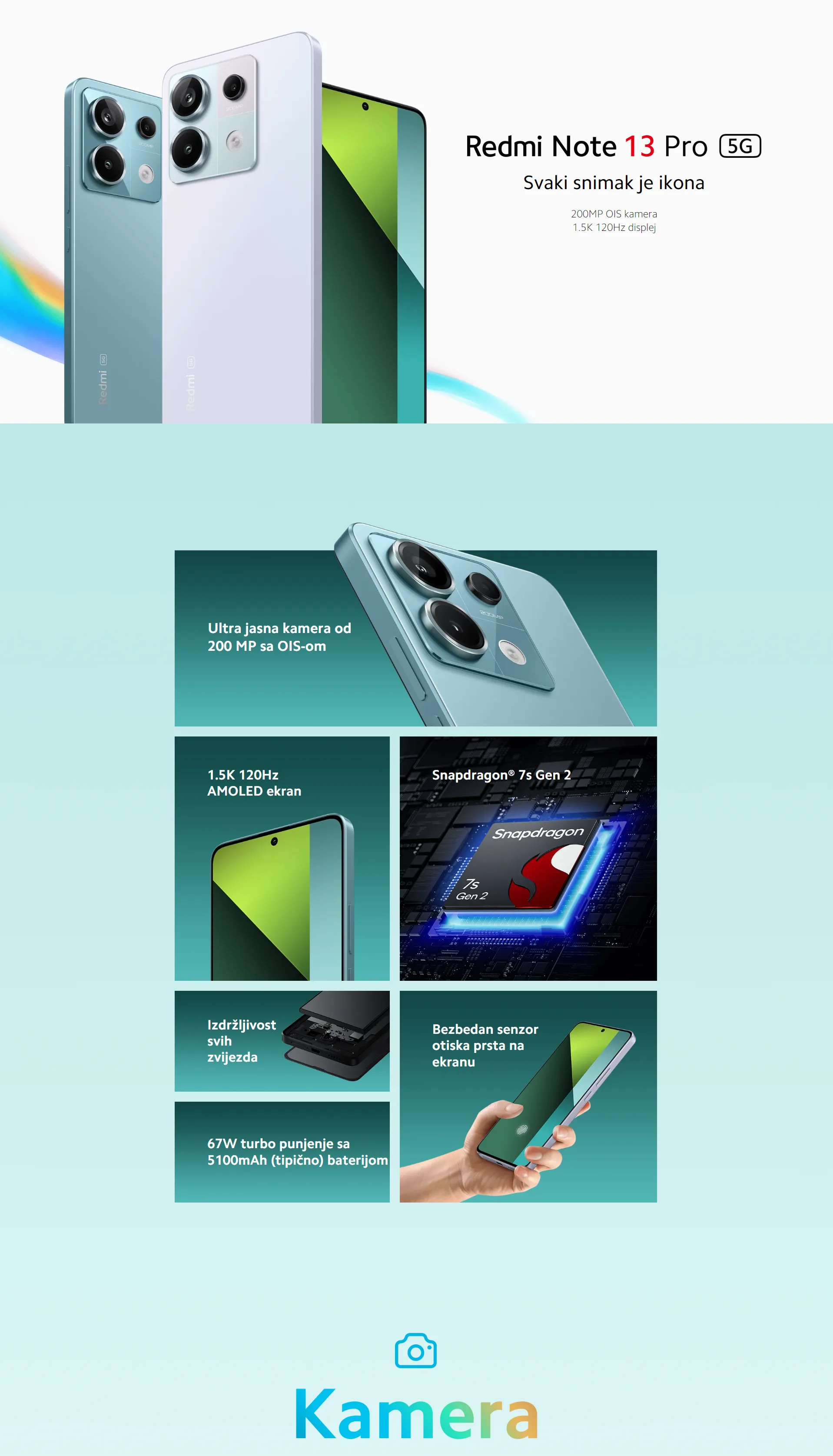 Redmi Note 13 Pro 5G sa svojim impresivnim setom kamera pruža sve što je potrebno za zapanjujuće fotografije i video zapise, čineći svaki trenutak vrednim pamćenja. Bez obzira da li snimate pejzaže, detalje iz blizine, ili važne životne trenutke, ovaj telefon je spreman da ispuni sve vaše kreativne potrebe.