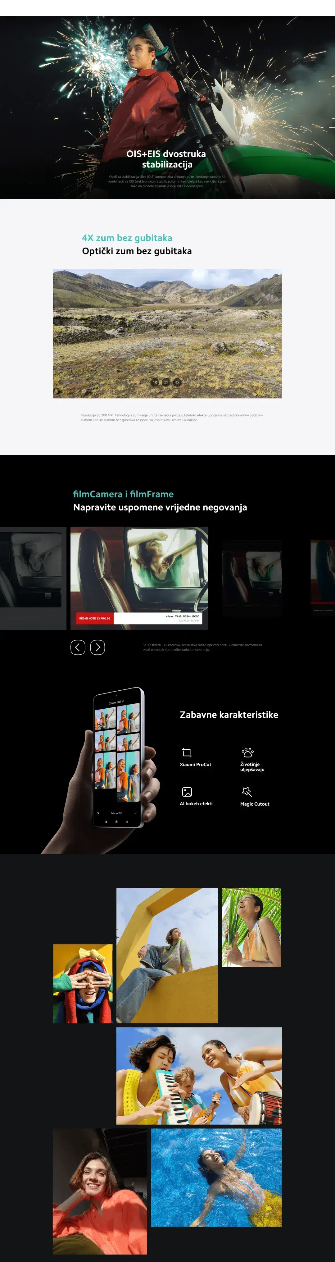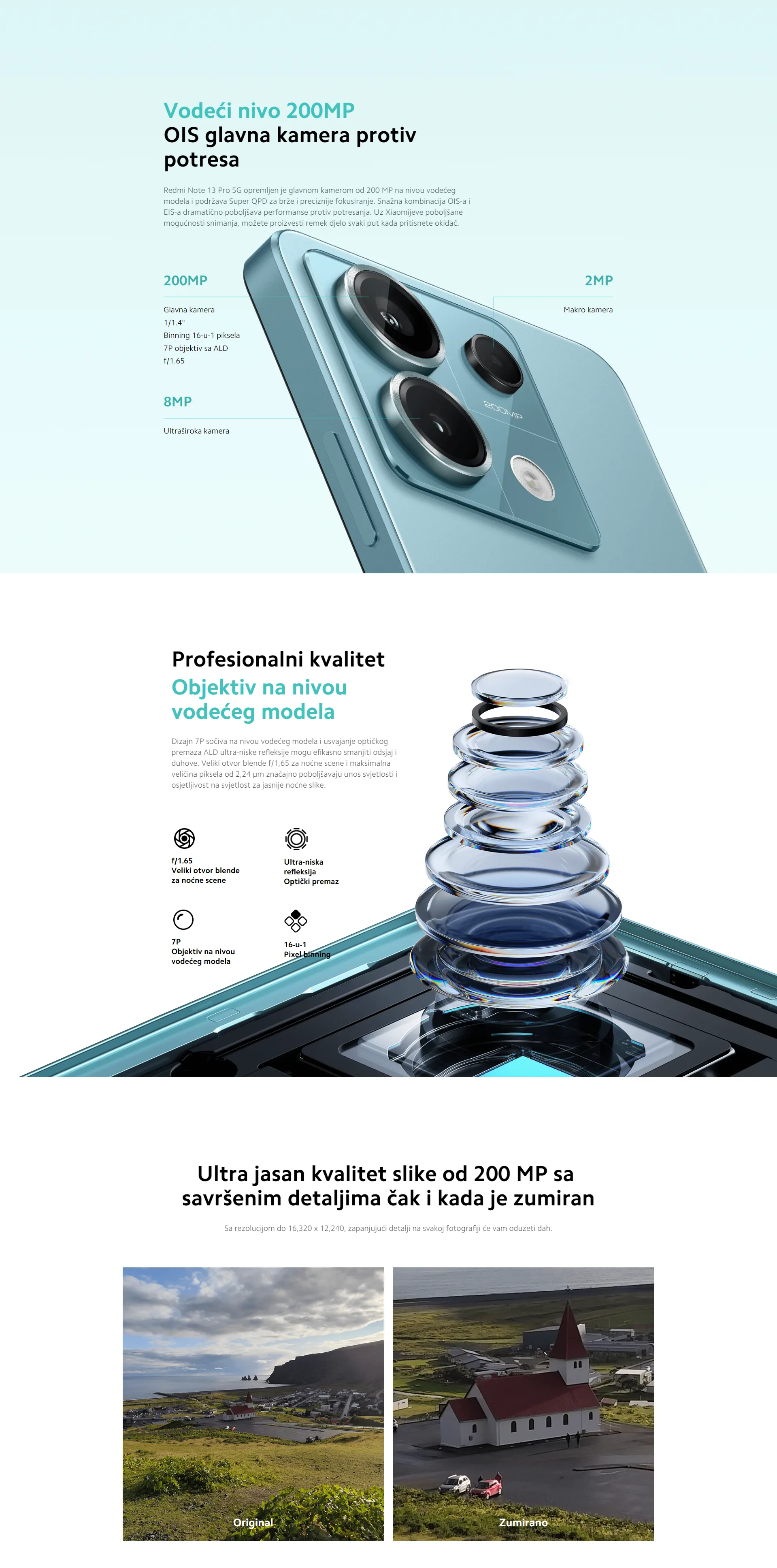 Redmi Note 13 Pro 5G podiže standarde fotografije u srednjem cenovnom rangu sa svojom naprednom kamerom od 200 MP. Ovaj telefon dokazuje da visokokvalitetne fotografije nisu privilegija samo premium uređaja. Sa glavnim senzorom od 200MP, otvorom blende f/1.65, širokougaonim objektivom od 23mm, i impresivnom veličinom piksela od 2.24μm, ovaj uređaj beleži izuzetan nivo detalja. Zahvaljujući multi-directional PDAF i optičkoj stabilizaciji slike (OIS), svaka fotografija je kristalno jasna, čak i u dinamičnim ili slabo osvetljenim uslovima.