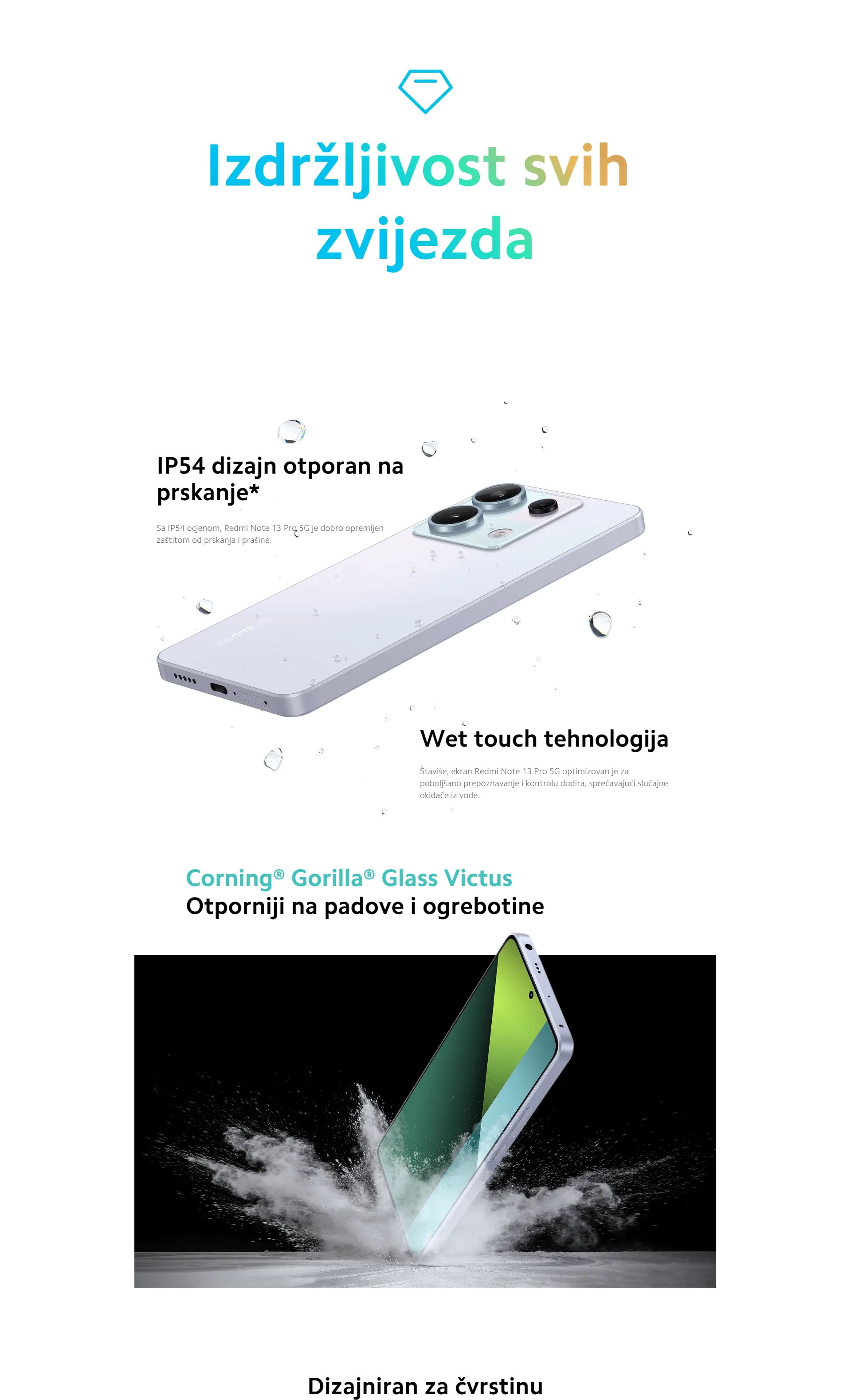 Note 13 Pro 5G ne samo da izgleda impresivno, već je i izgrađen da izdrži. Sa Corning Gorilla Glass Victus zaštitom i IP54 ocenom, ovaj telefon je spreman za svaku avanturu, pružajući mir uma u svakodnevnim izazovima, bilo da je reč o nespretnim padovima, prskanju vode ili prašini.