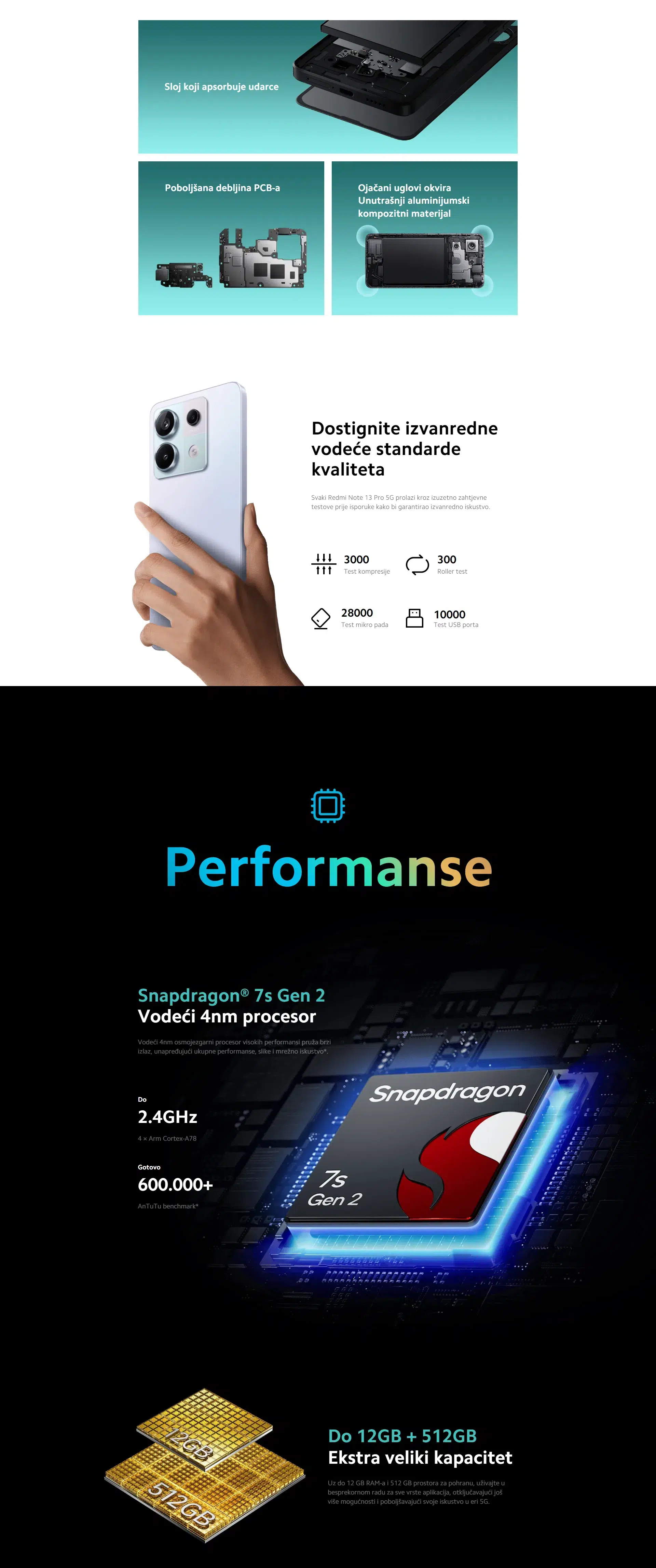 Redmi Note 13 Pro 5G je opremljen moćnim Qualcomm Snapdragon 7s Gen 2 procesorom, koji dolazi sa osmojezgarnom konfiguracijom, uključujući 4 jezgra Cortex-A78 radnog takta do 2.40 GHz za visoke performanse i 4 jezgra Cortex-A55 radnog takta do 1.95 GHz za efikasnost.