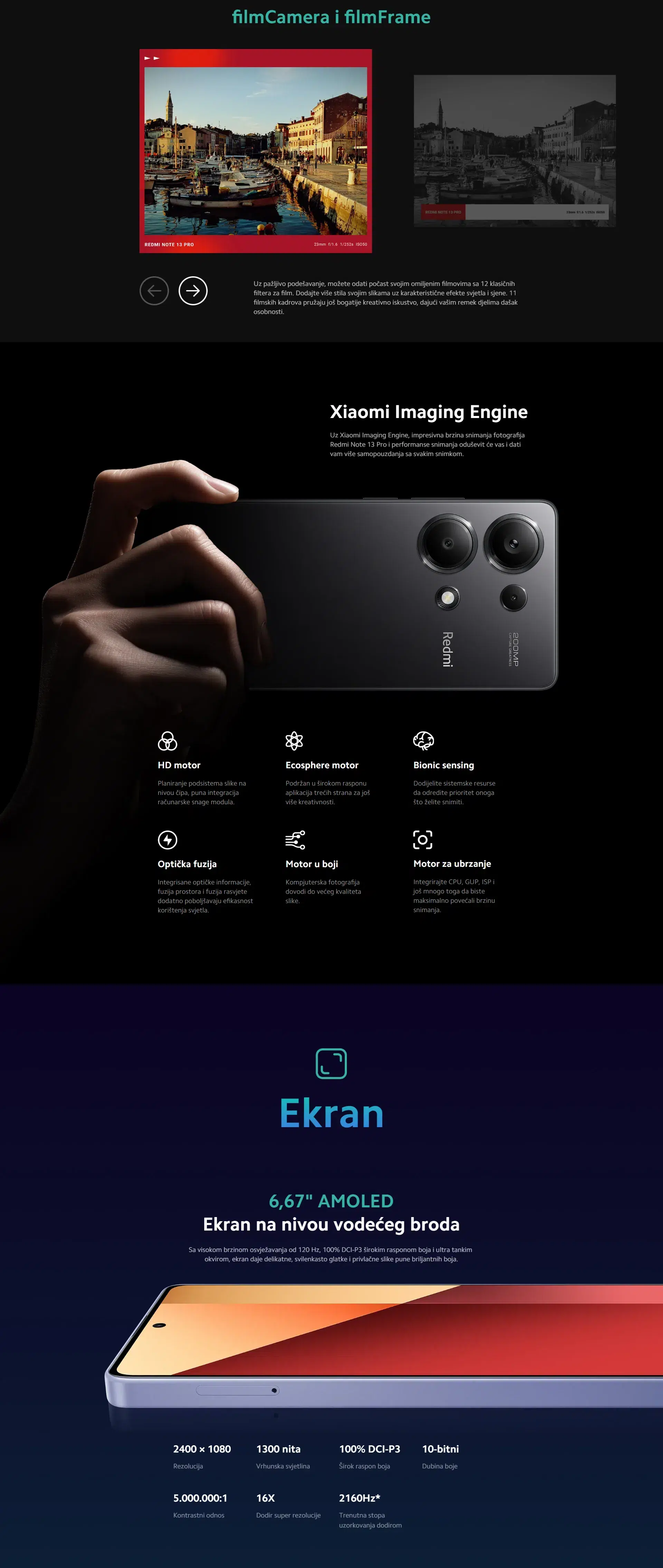 Redmi Note 13 Pro kombinuje ove hardverske sposobnosti sa Xiaomi-jevim softverskim veštinama, nudeći korisnički interfejs koji je jednostavan za korišćenje i intuitivne režime snimanja. Bez obzira na vaše iskustvo u fotografiji, na raspolaganju su brojne opcije za istraživanje kreativnosti, od profesionalnih kontrola do zabavnih filtera i efekata, čineći ovaj telefon savršenim alatom za svaku fotografisanu priliku.