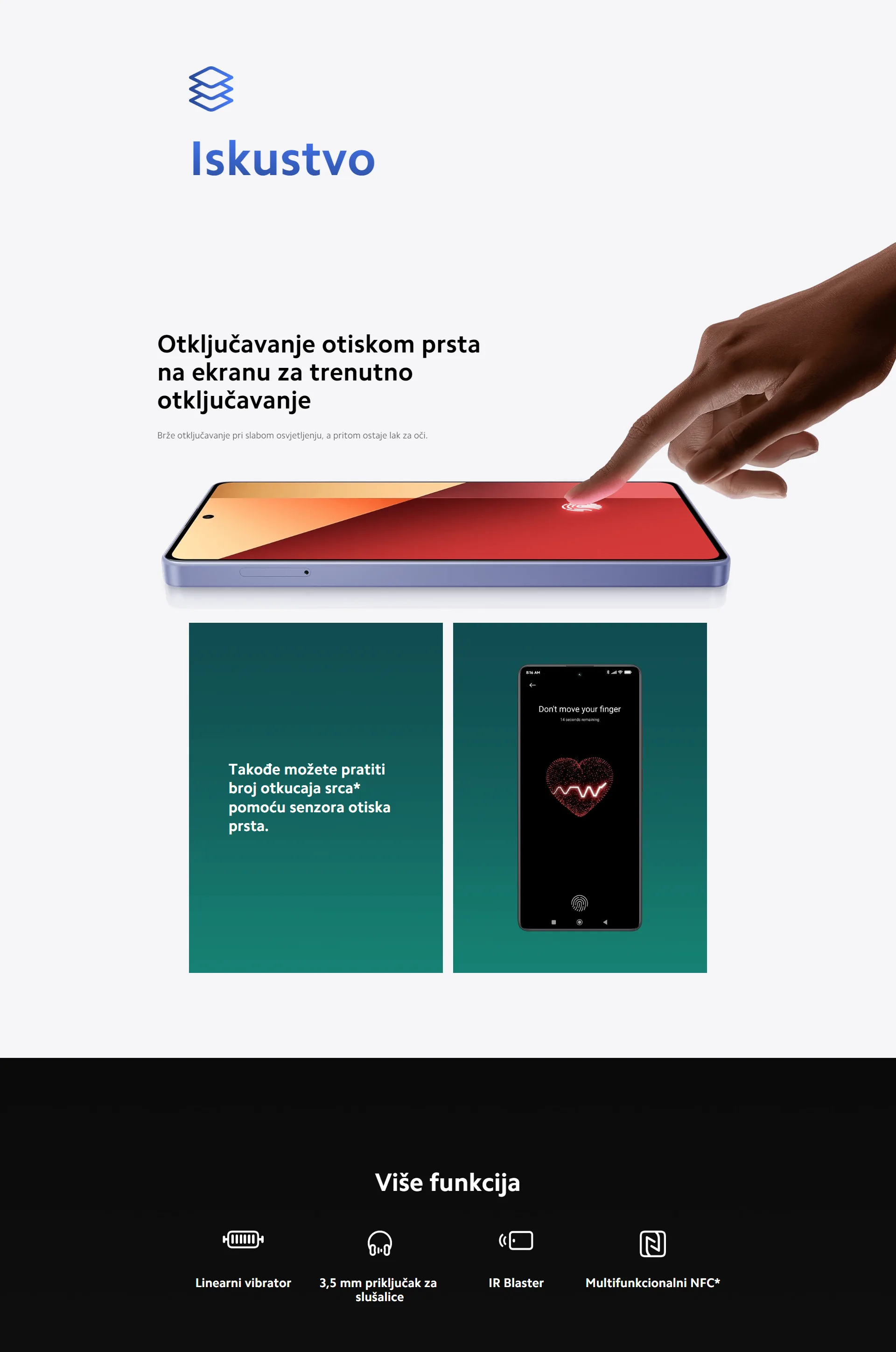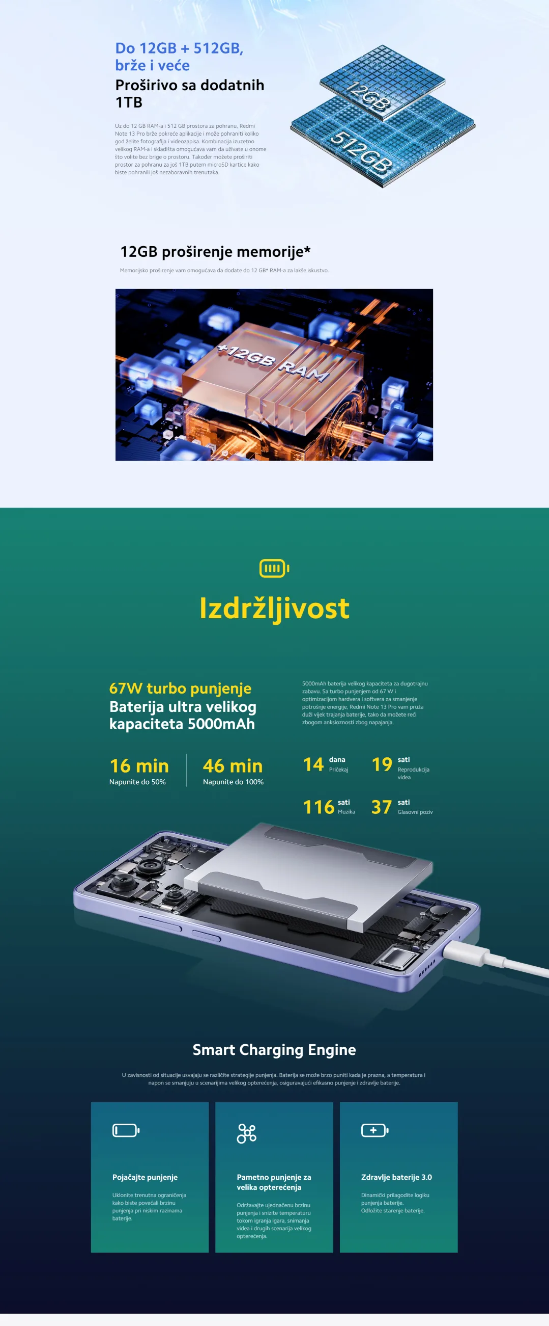 Osim što nudi izvanrednu brzinu, Redmi Note 13 Pro takođe pametno upravlja procesom punjenja kako bi osigurao dugovečnost baterije. Ovim pristupom, rizik od oštećenja usled pregrevanja ili brzog trošenja baterije se minimizira, omogućavajući vam da bezbrižno koristite telefon, znajući da je energetski sistem dizajniran da traje.