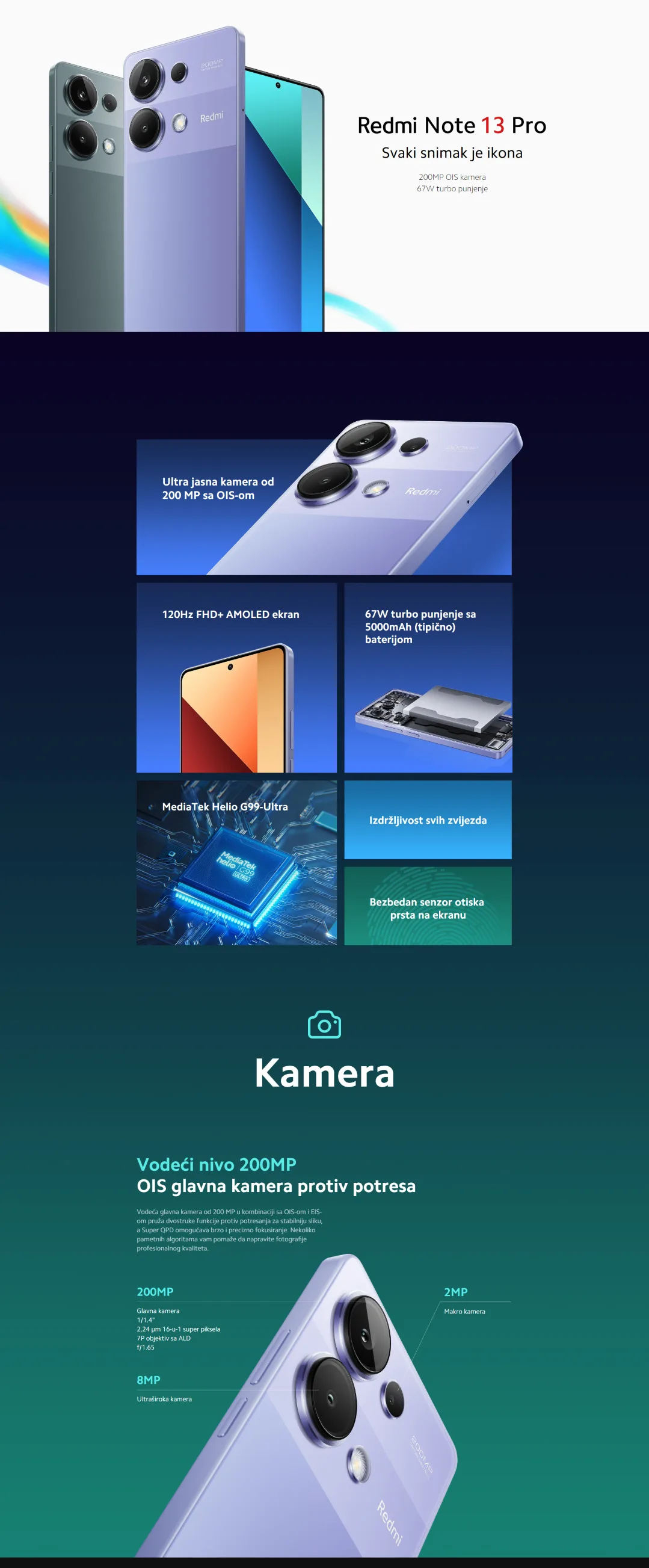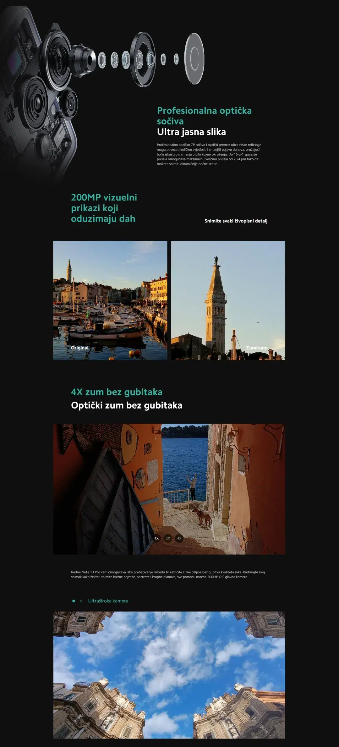 Sistem kamera na Redmi Note 13 Pro predstavlja pravu poslasticu kako za ljubitelje fotografije tako i za one koji fotografiju doživljavaju kao svakodnevni hobi. Centralna tačka ovog impresivnog sistema svakako je glavna kamera sa senzorom od 200MP, koja pruža izuzetan nivo detalja.
