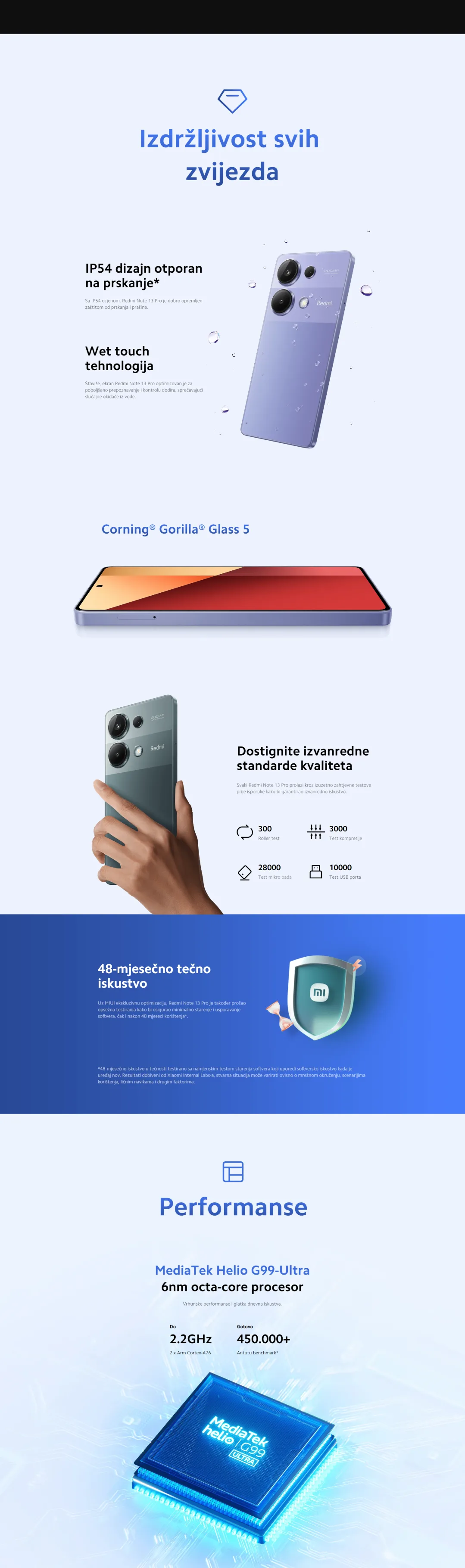 Redmi Note 13 Pro ne samo da izgleda impresivno, već je i dizajniran da izdrži razne uslove. Zahvaljujući IP54 sertifikatu, uređaj je otporan na prašinu i kapljice vode, čineći ga pouzdanim izborom za svakodnevne avanture. Bilo da vas zadesi neočekivani pljusak ili se nađete na prašnjavom putu, možete biti sigurni da će vaš telefon izdržati izazove.