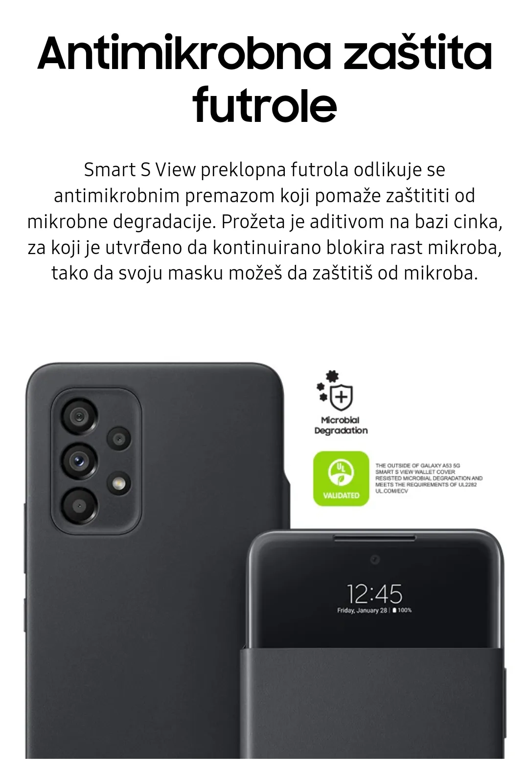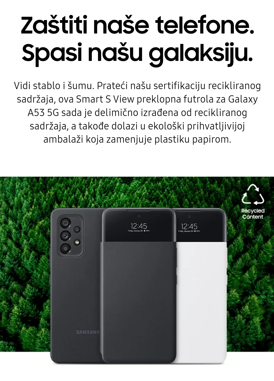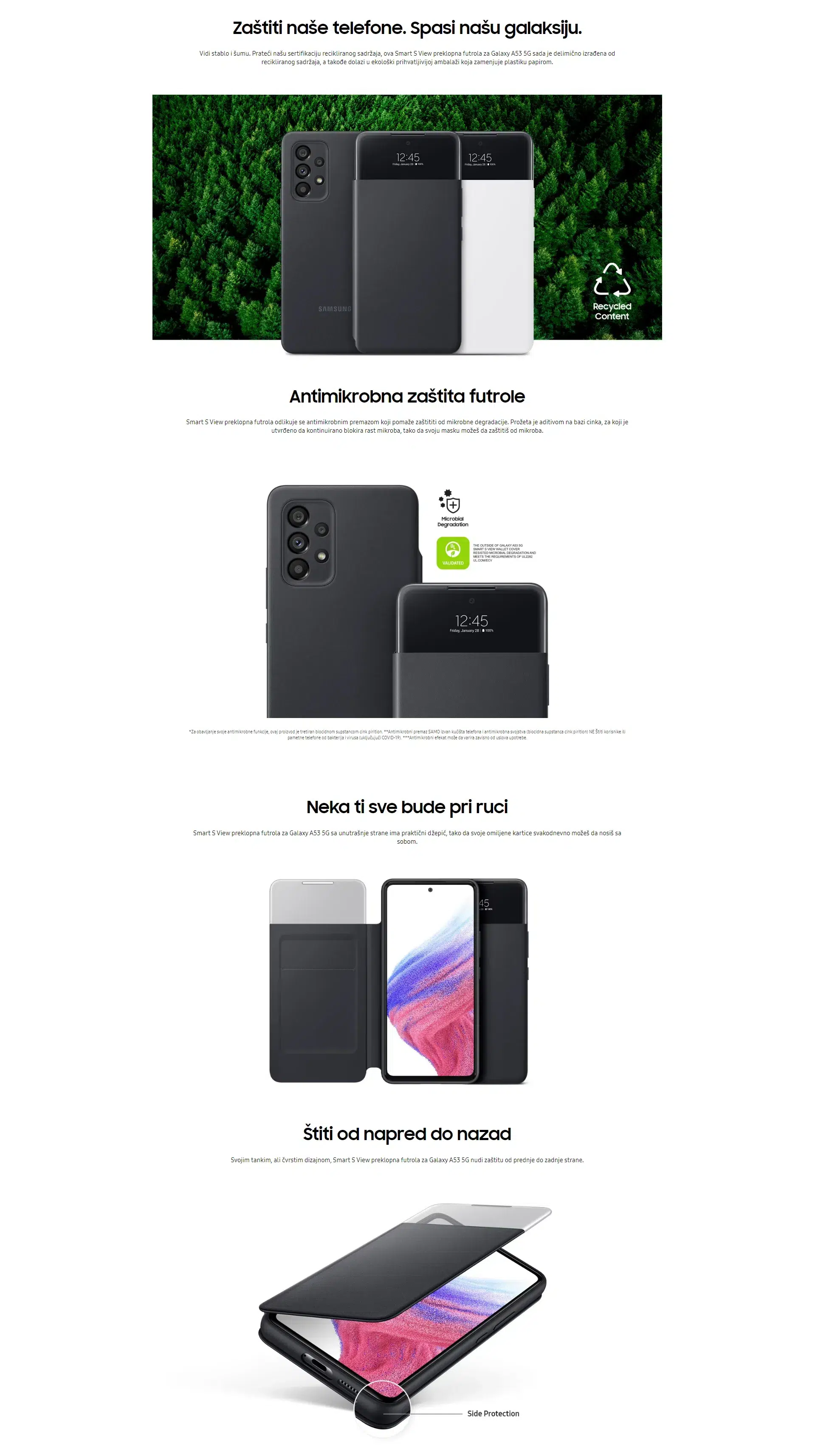 Upoznajte se sa zaštitnom futrolom za Galaxy A53, sa kojom možete pristupiti ekranu bez da otvarate futrolu. Izrađena je od recikliranih i biomaterijala sa sertifikatom UL, za očuvanje životne sredine.